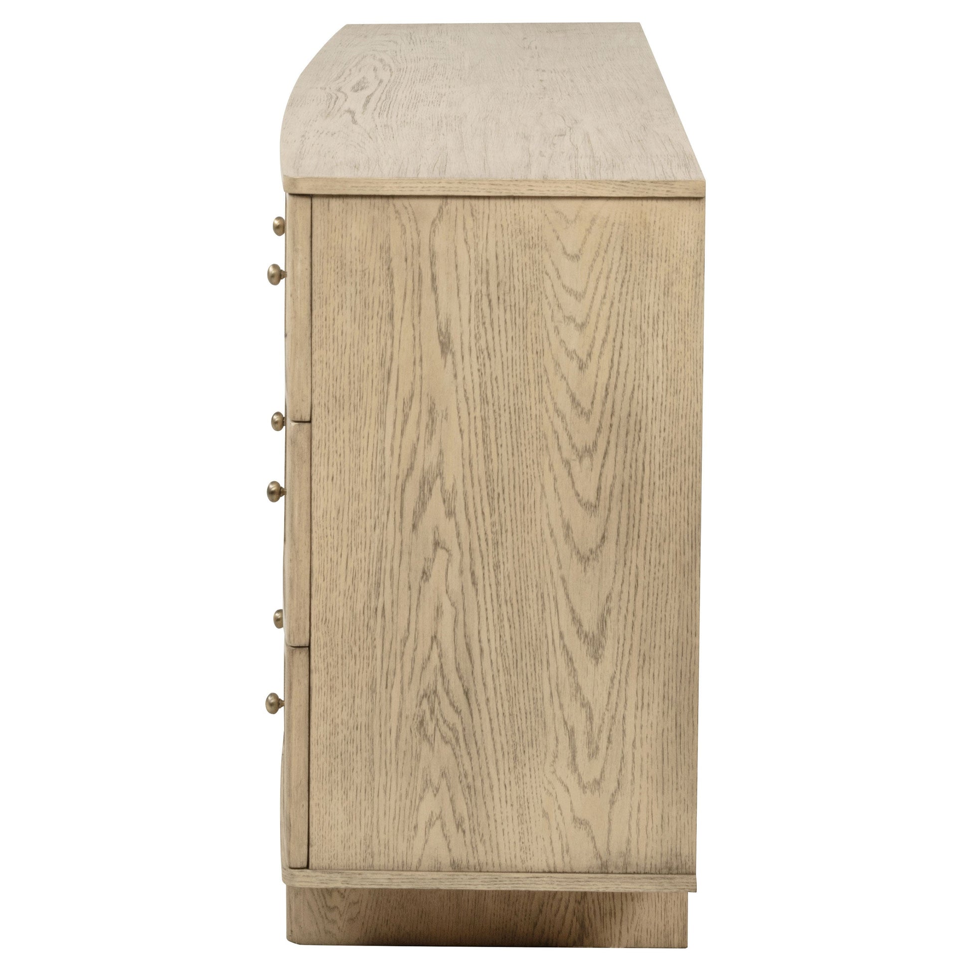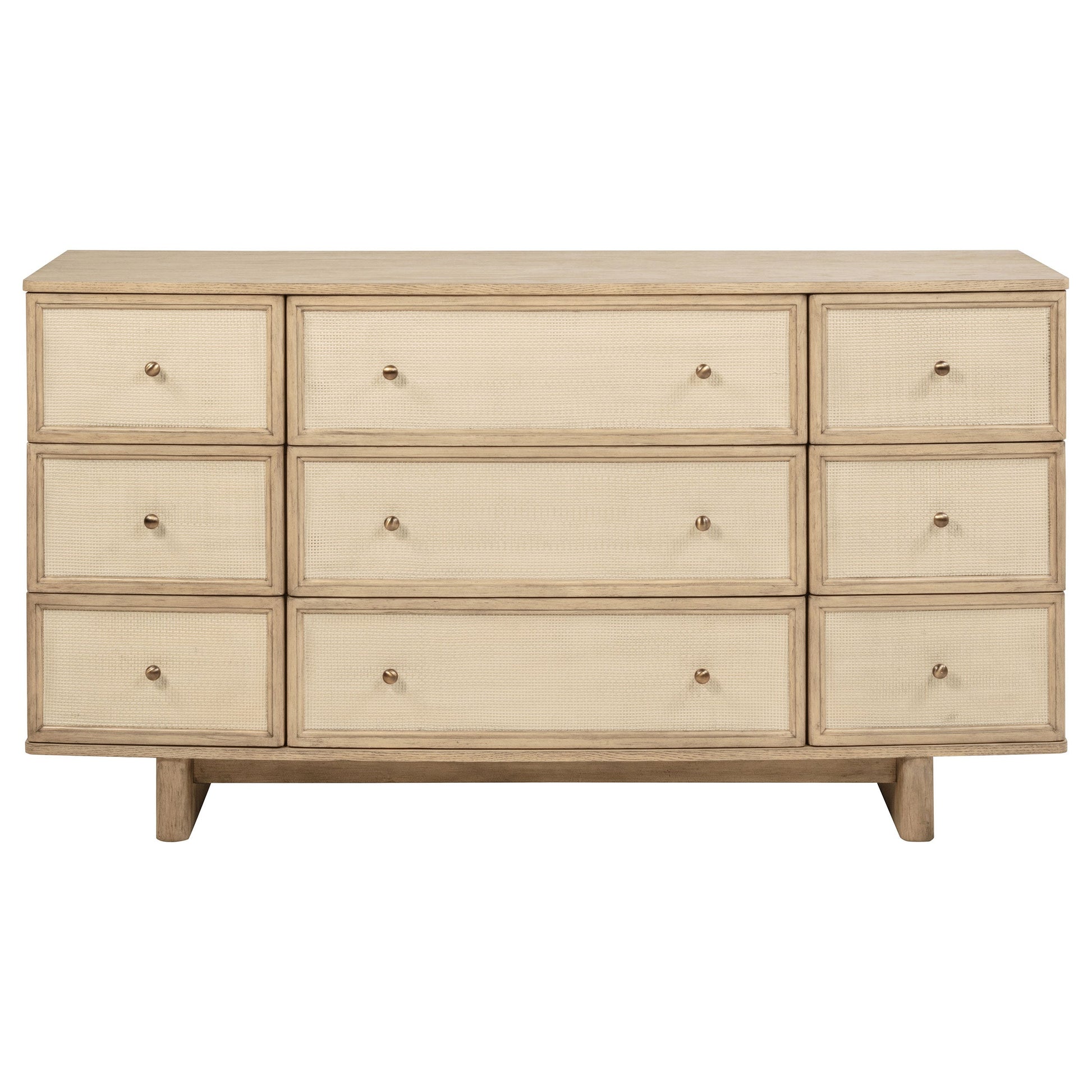 This dresser and mirror set combines functionality with a refined aesthetic, offering a complete solution for your bedroom storage and style needs. The nine-drawer dresser provides ample space for organizing your wardrobe, while the mirror enhances light and adds depth to your room. Finished in a soothing beige oak, this set is accented by antique brass hardware, offering a sophisticated, timeless appeal. The smooth-glide drawers ensure easy access and functionality. Together, the dresser and mirror create a harmonious and elegant focal point for your bedroom.