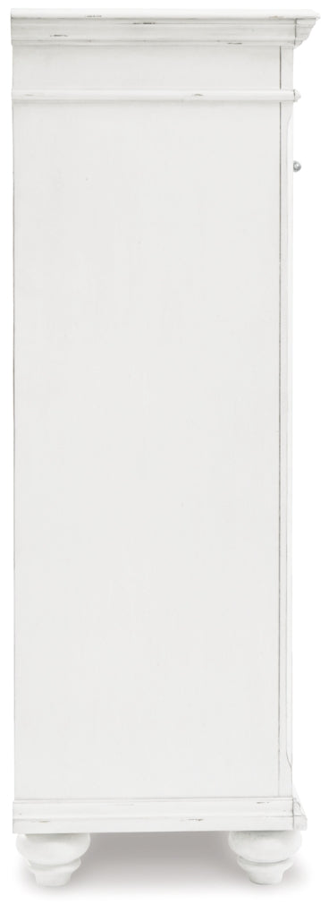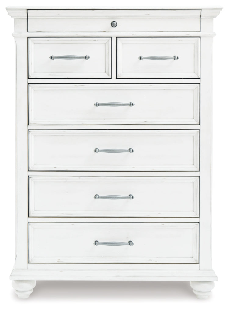 Give your retreat vintage charm with this chest. Sporting a beautifully distressed whitewash finish, it includes seven varied-sized drawers for an organized wardrobe. Generously scaled moulding from top to bottom, along with bun feet and drawer handles with a transitional aesthetic, give this chest characterÑevoking the feel of a quaint cottage escape.