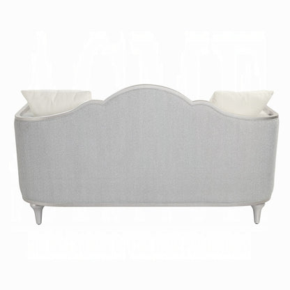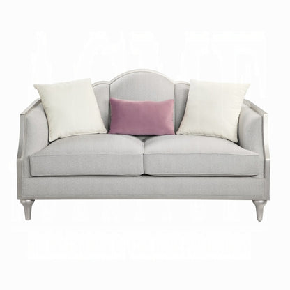 Outlined with wooden trim for a traditional cabriole silhouette with a camel back backrest feature, the Kasa loveseat is for those that seek a classic design. The beige linen fabric is soft to the touch and perfectly contrasts with the champagne wooden finish. This loveseat is a modern take on the French-traditional style. Three throw pillows in varying colors and sizes are included.