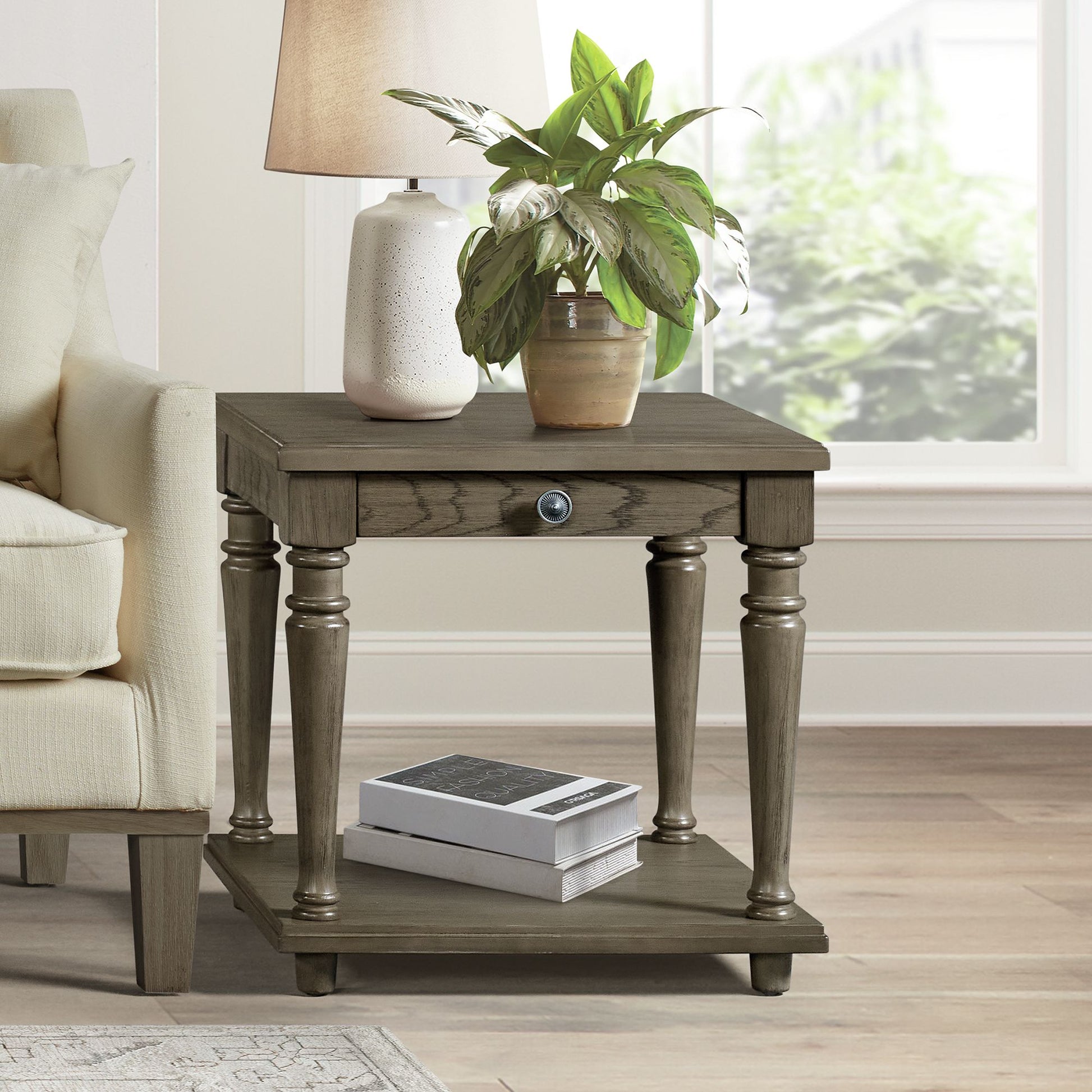 The Kings Court End Table is a stylish and functional addition to your living room or bedroom. Constructed of durable materials including MDF, Rubberwood, and Oak Veneer, this end table is built to last. It features a convenient storage drawer for stashing remote controls or other small items, as well as a bottom shelf for additional storage or display space. The table also includes a USB and power strip, making it easy to charge your devices while sitting on the couch or in bed. Grey metal hardware adds a modern touch to this versatile piece of furniture.
