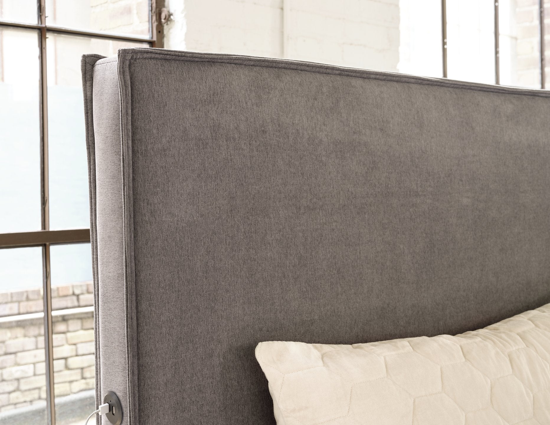 With a contemporary silhouette and downtown flair, this queen upholstered panel bed seamlessly fits in with existing modern decor. Its clean-lined profile and tailored slate gray upholstery give an urban sophistication. This chic bed also features a double flange welt around the perimeter for a polished look. And with a USB charging port conveniently located on each side of the headboard, it's right up to speed with your high-tech lifestyle.
