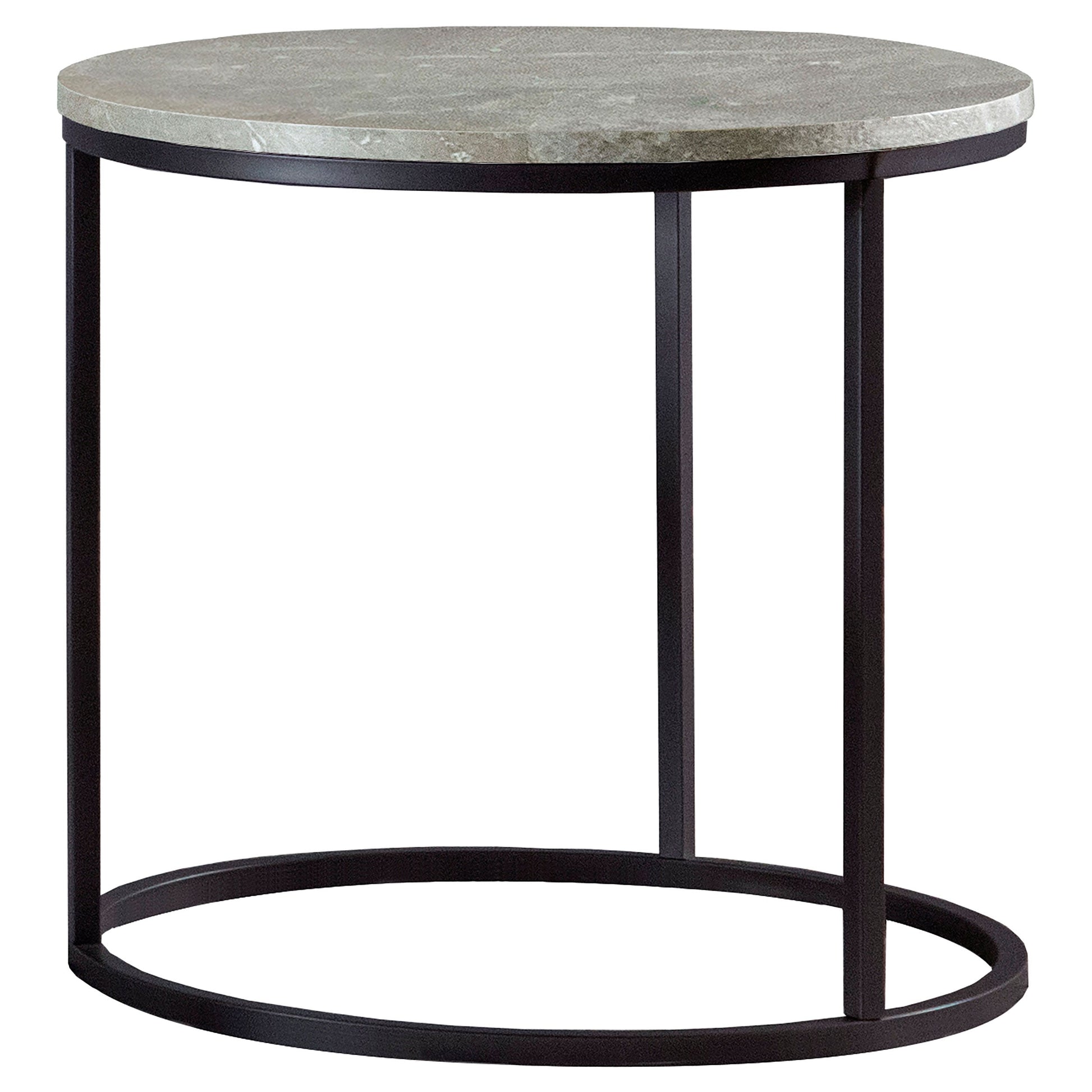 This sleek end table combines minimalist design with modern materials to create a striking accent piece. Featuring a round faux marble tabletop in grey, the piece is complemented by a sturdy gunmetal metal base. Its compact size makes it perfect for smaller spaces, while its refined design adds a touch of sophistication. Ideal for placement beside an armchair or sofa, this end table is a versatile choice for contemporary living rooms or bedrooms.