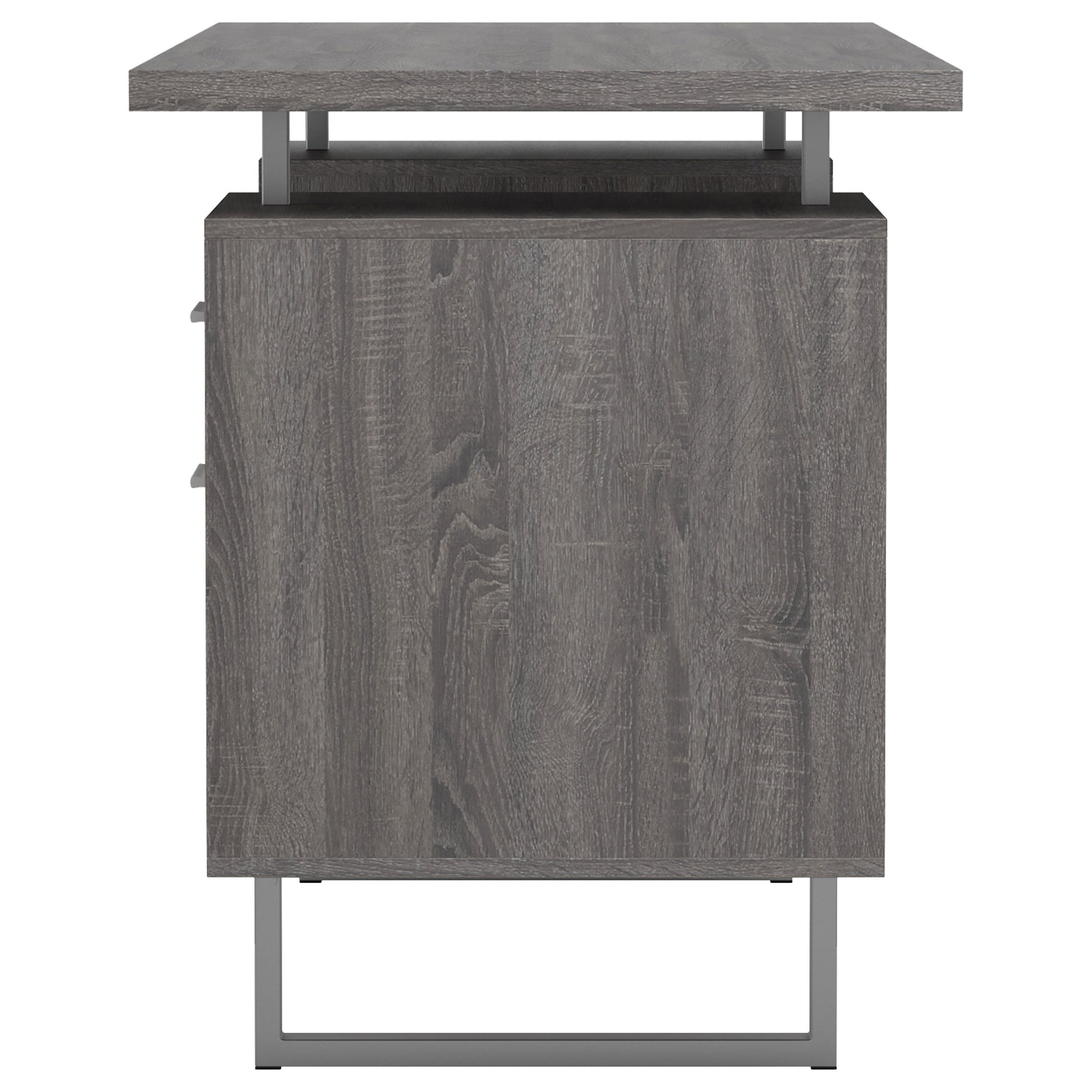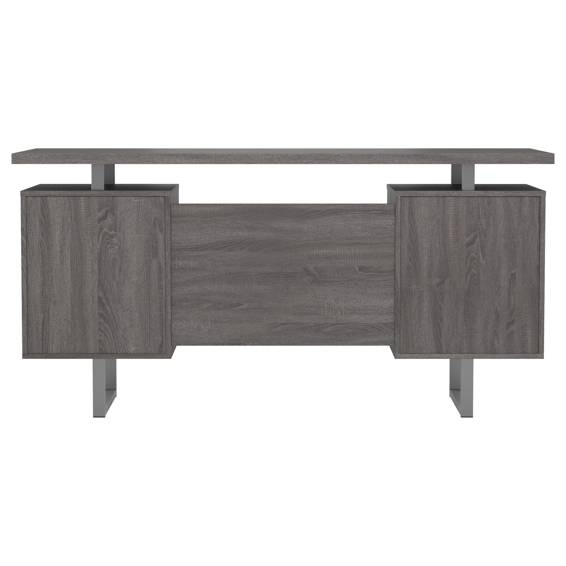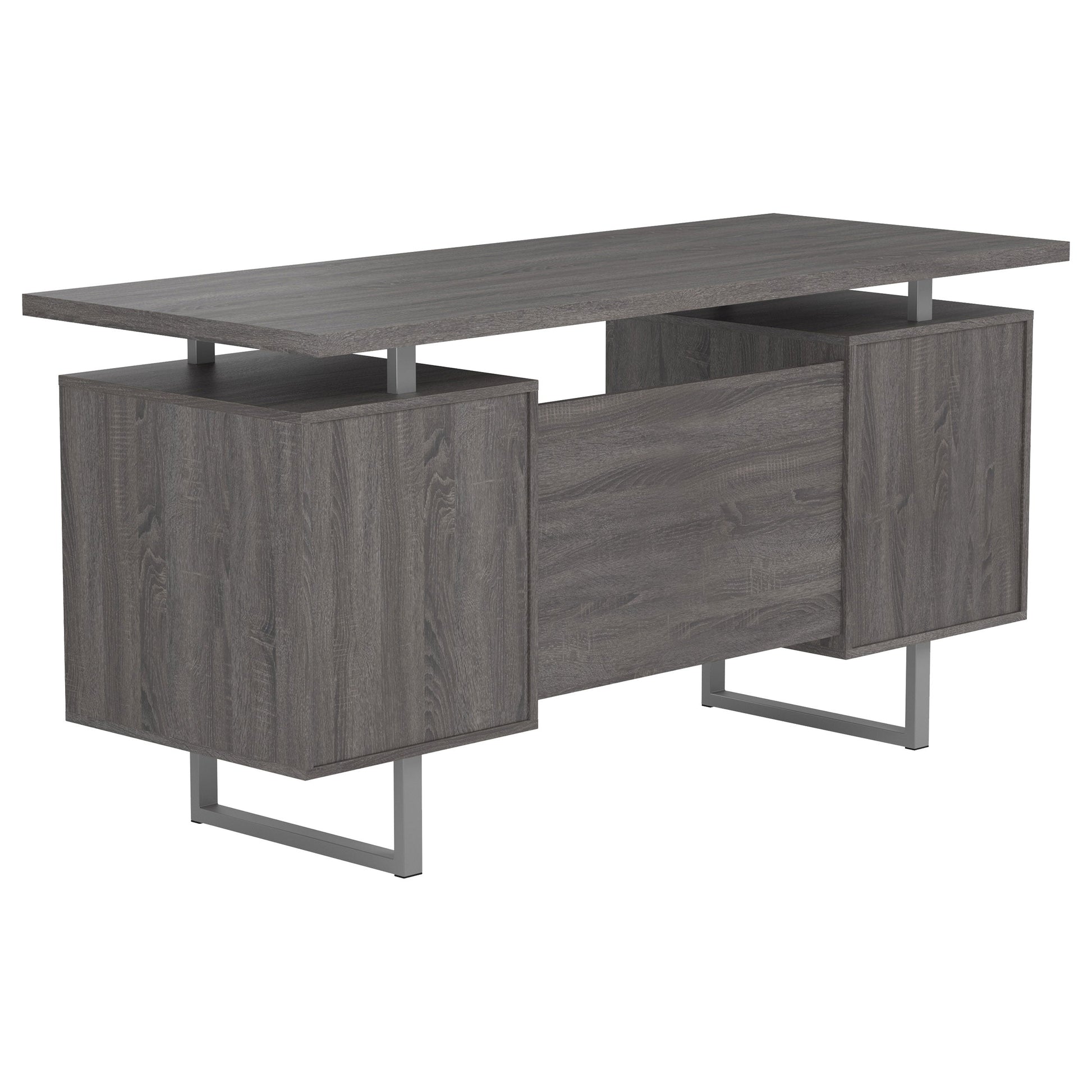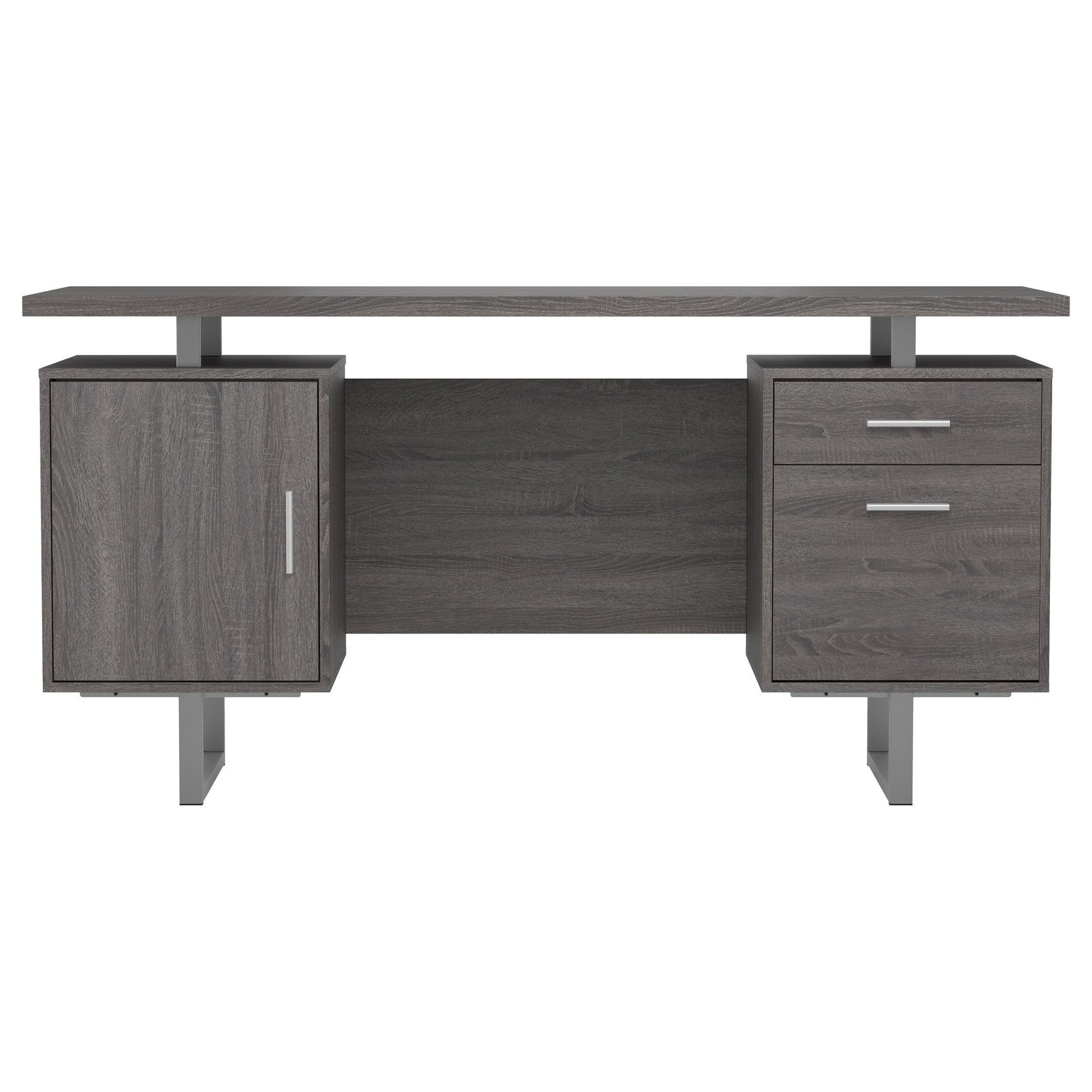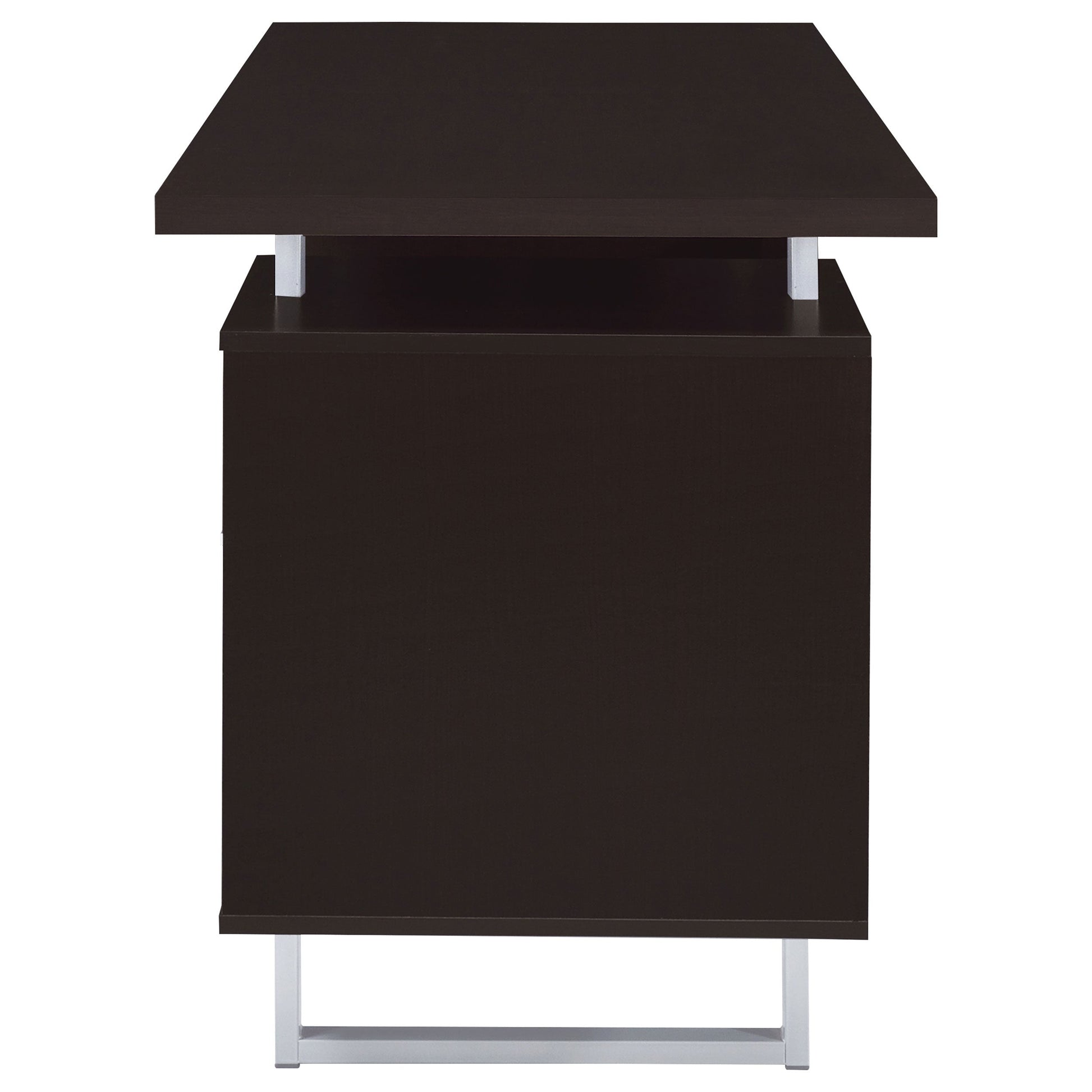 Chic and modern, this wooden writing desk creates a gorgeous focal point in any home office. Sleek lines of silver finished metal create a sturdy foundation for its stylish design. A rectangular, floating tabletop adds visual intrigue to its clean silhouette. A storage cabinet, drawer, and file cabinet keep office essentials organized with ease. Available in your choice of attractive colors, there's an elegant option to effortlessly match with your space.