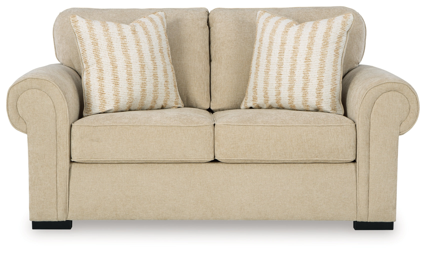 Traditional styling. Casual comfort. And plenty of room to stretch out. This loveseat is exactly your style. It beautifully references the past with roll arms and other classic touches. Better yet, the indulgently soft and light chenille upholstery incorporates a tranquil sensibility that feels right at home. Accent pillows with a reimagined patchwork design add the finishing touch.