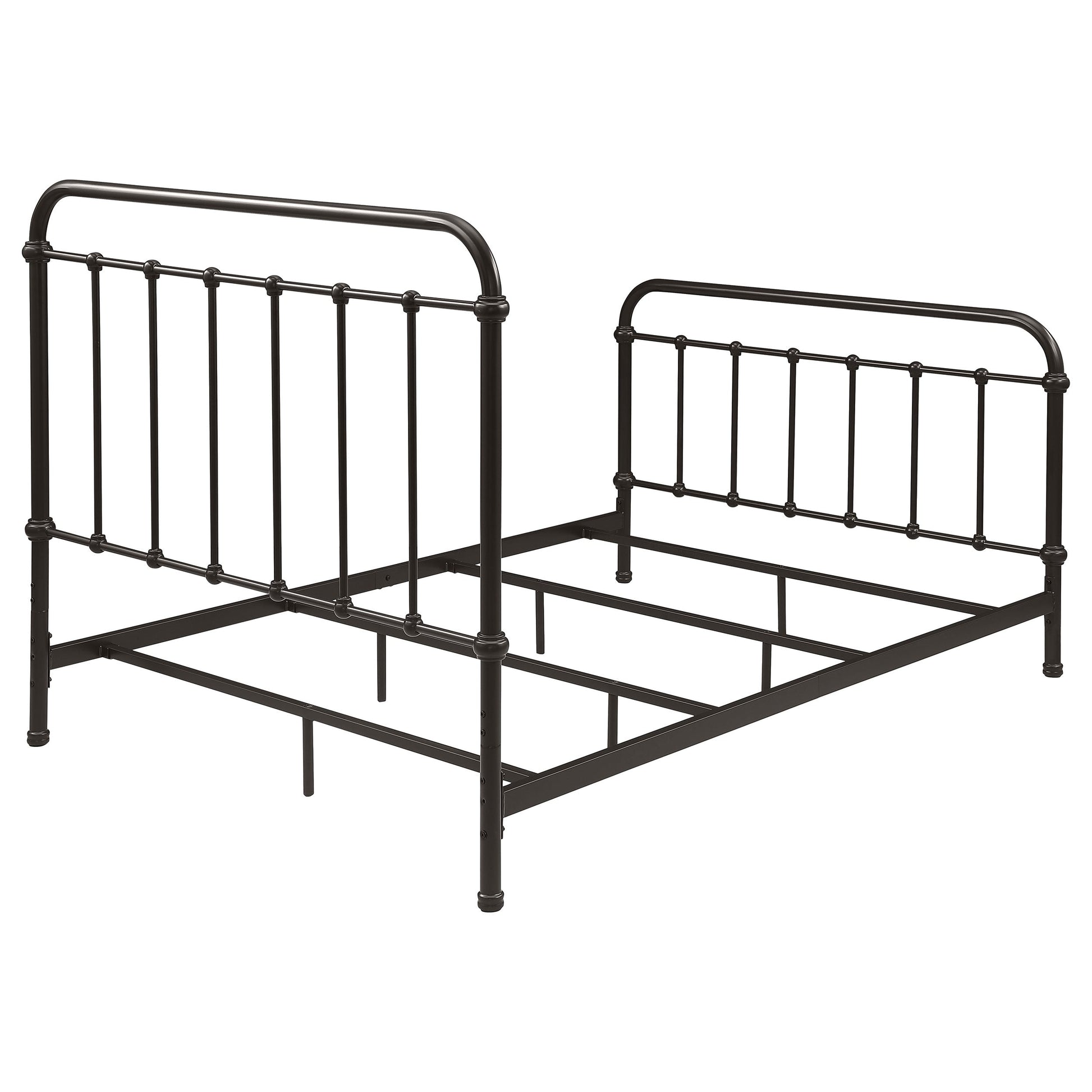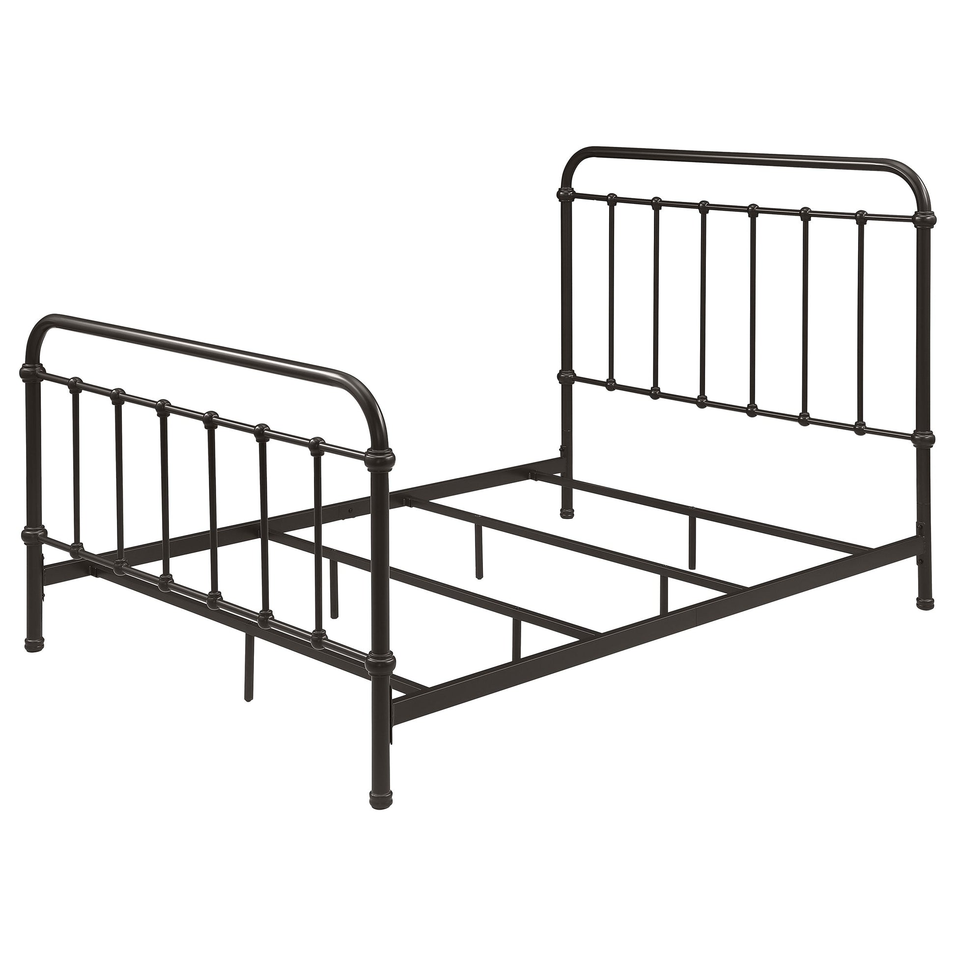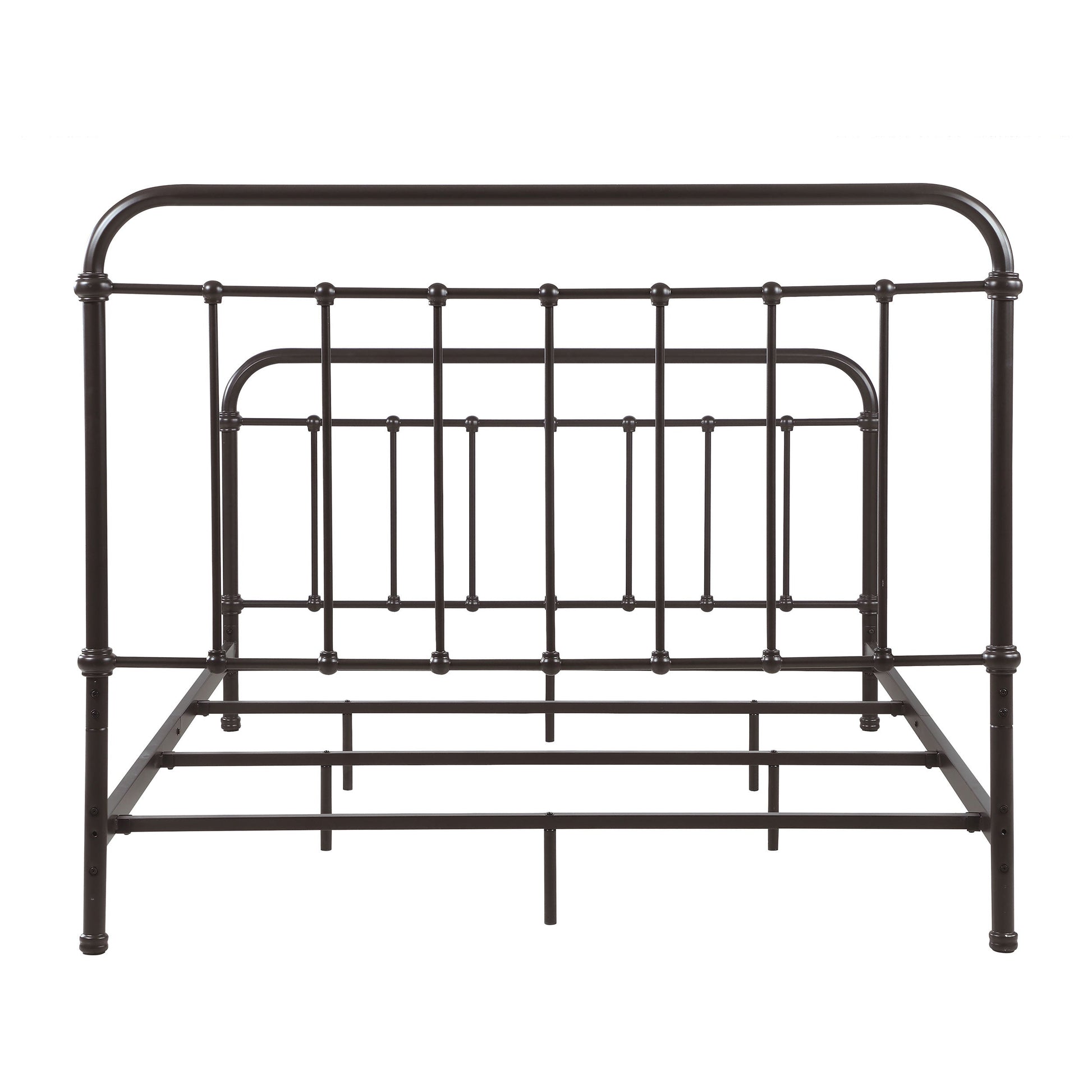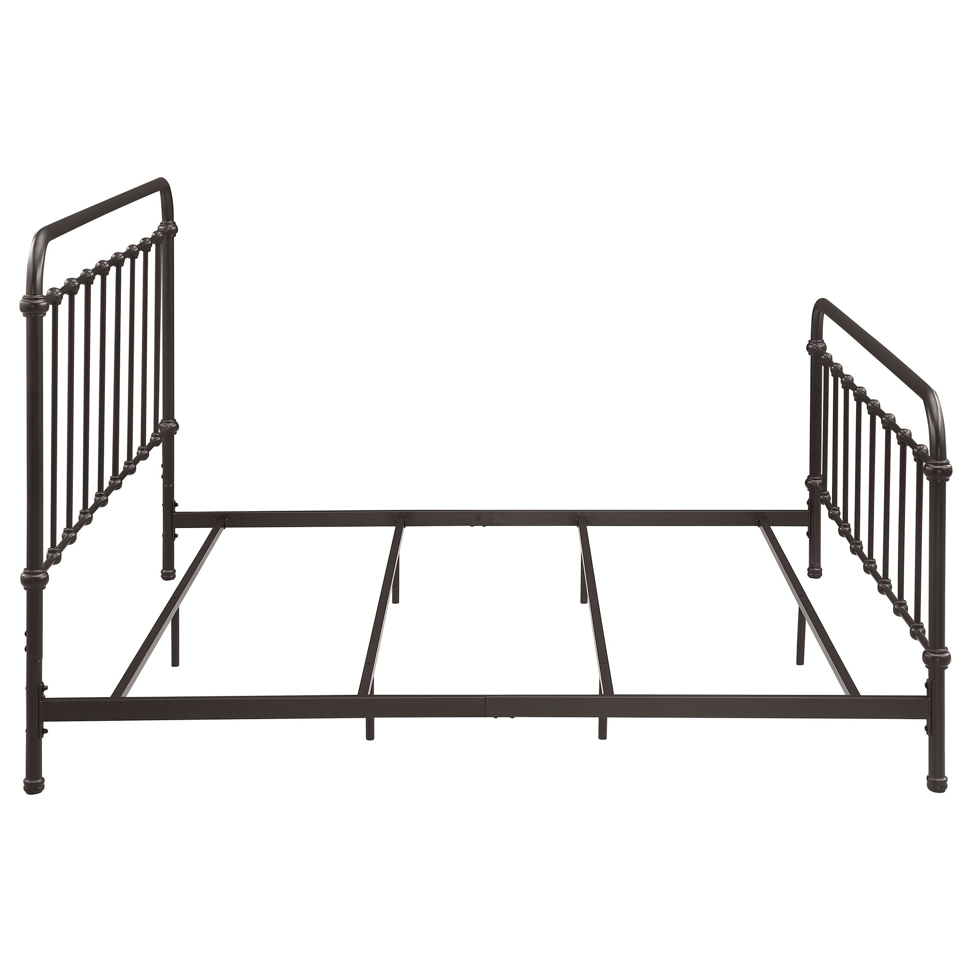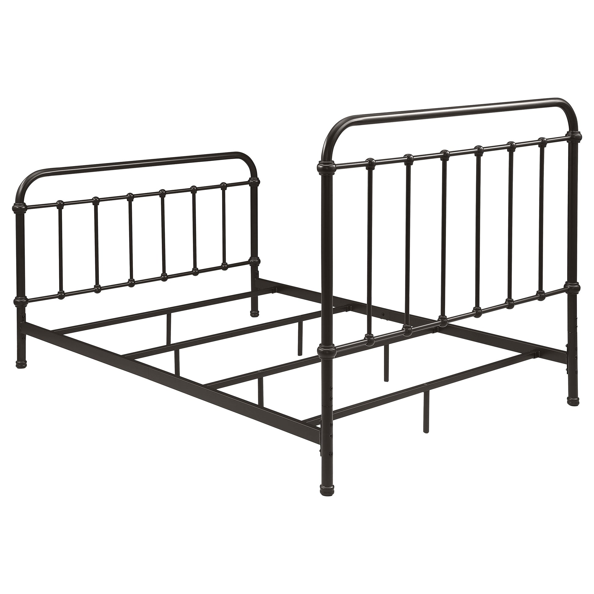 Bring vintage-inspired charm to your bedroom with this farmhouse-style metal bed. Designed with a sturdy heavy-gauge metal frame, it features a dark bronze powder-coated finish that enhances its timeless appeal. The headboard and footboard showcase a vertical spindle design with continuous weld construction for added strength and durability. Built for stability and long-lasting use, this bed adds rustic elegance to both modern and classic interiors.