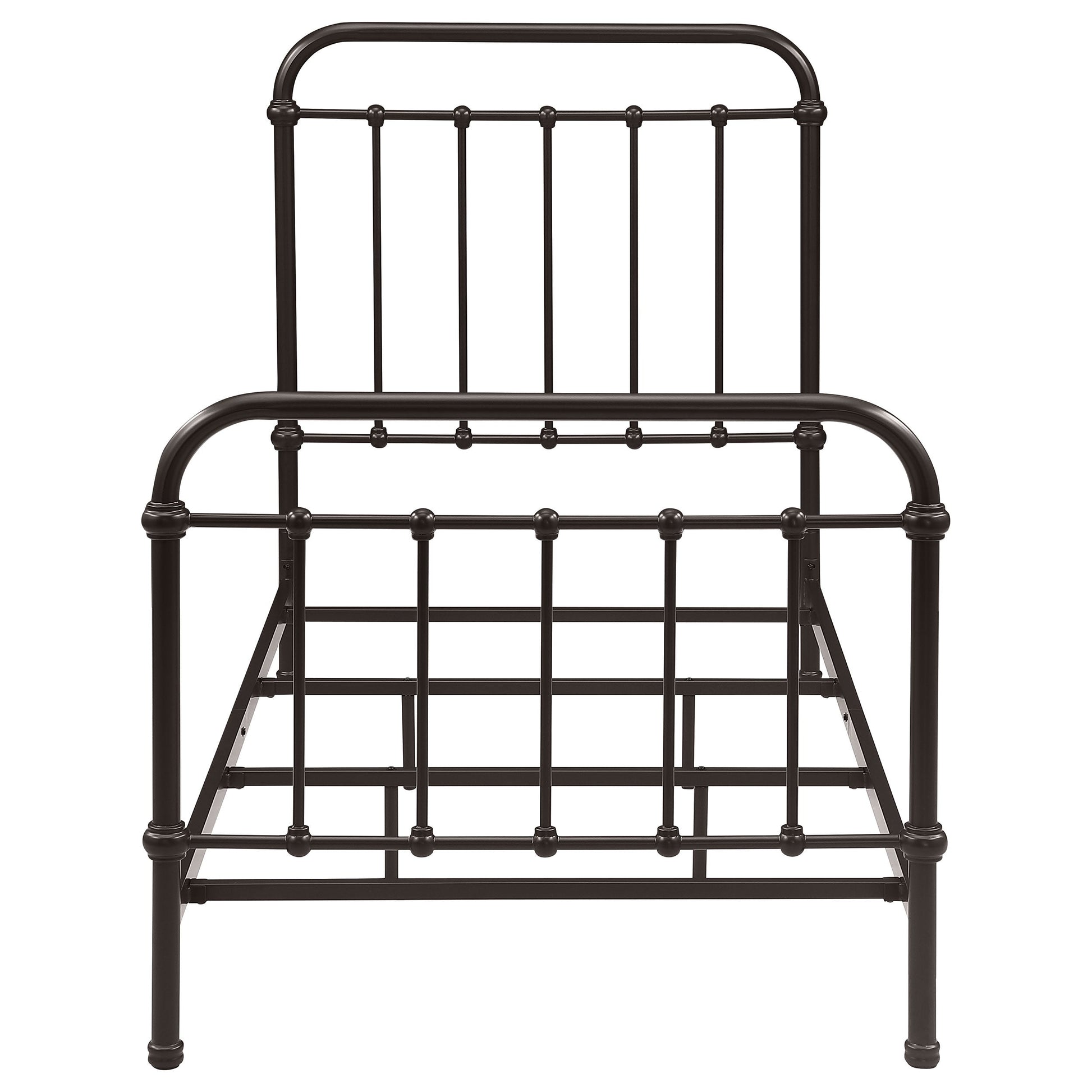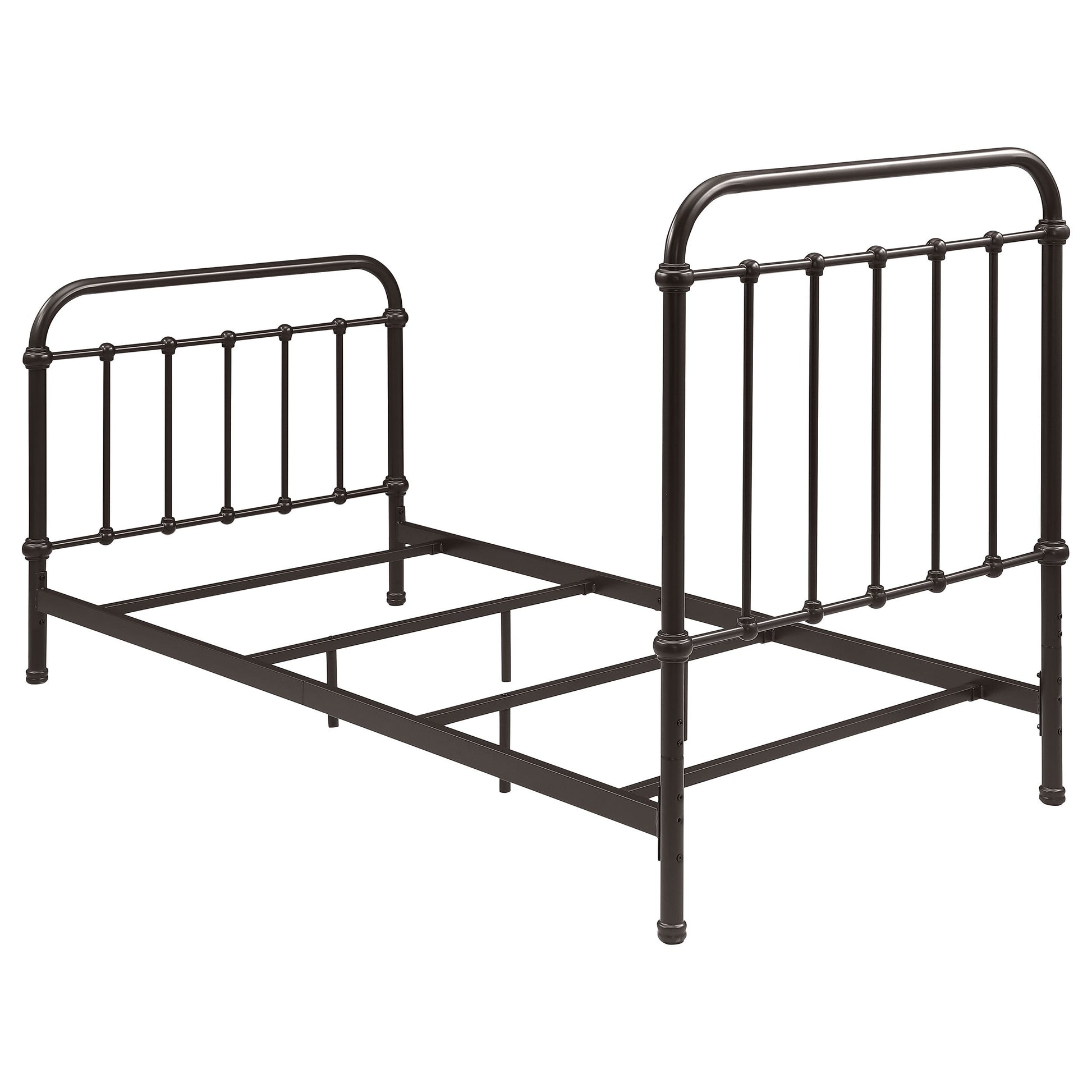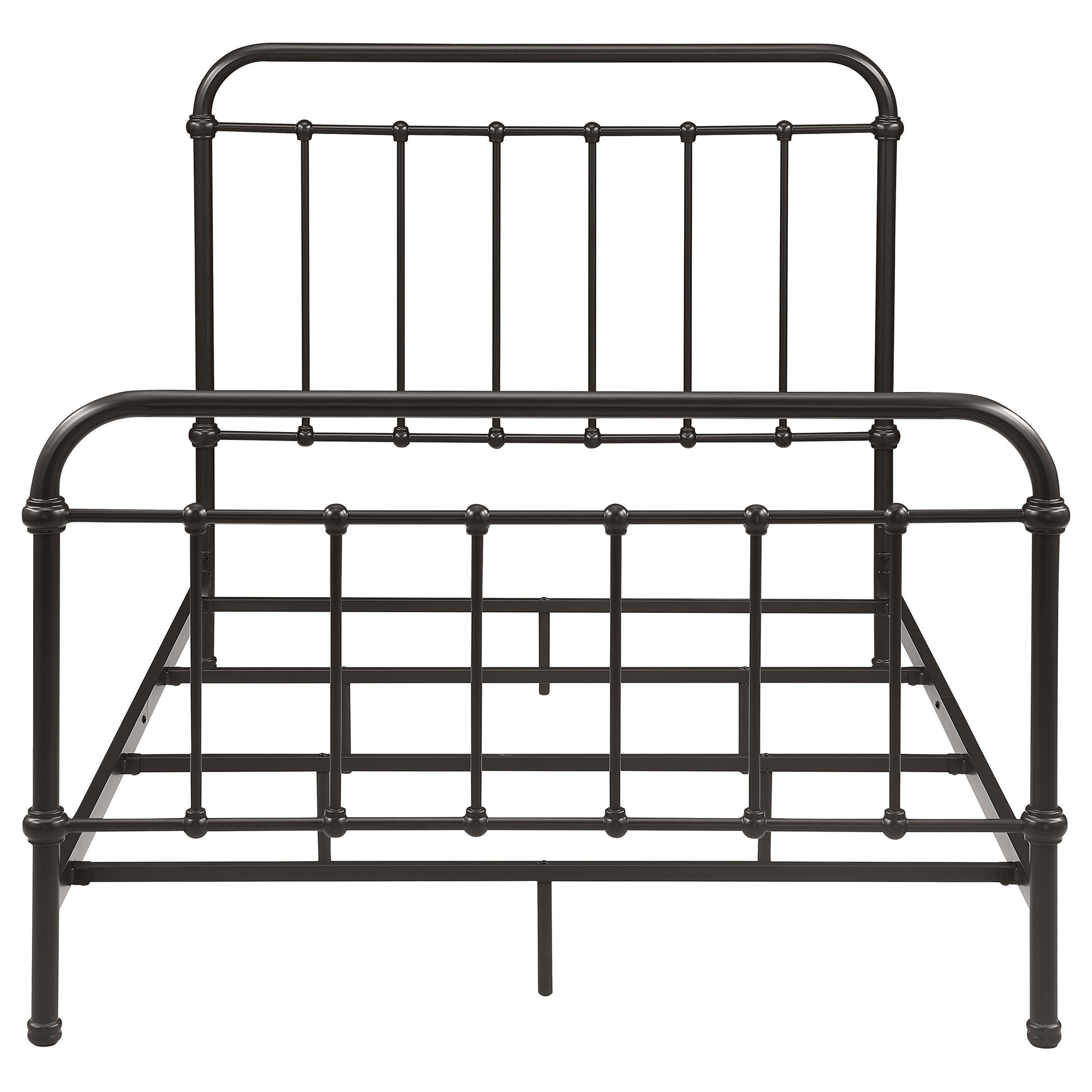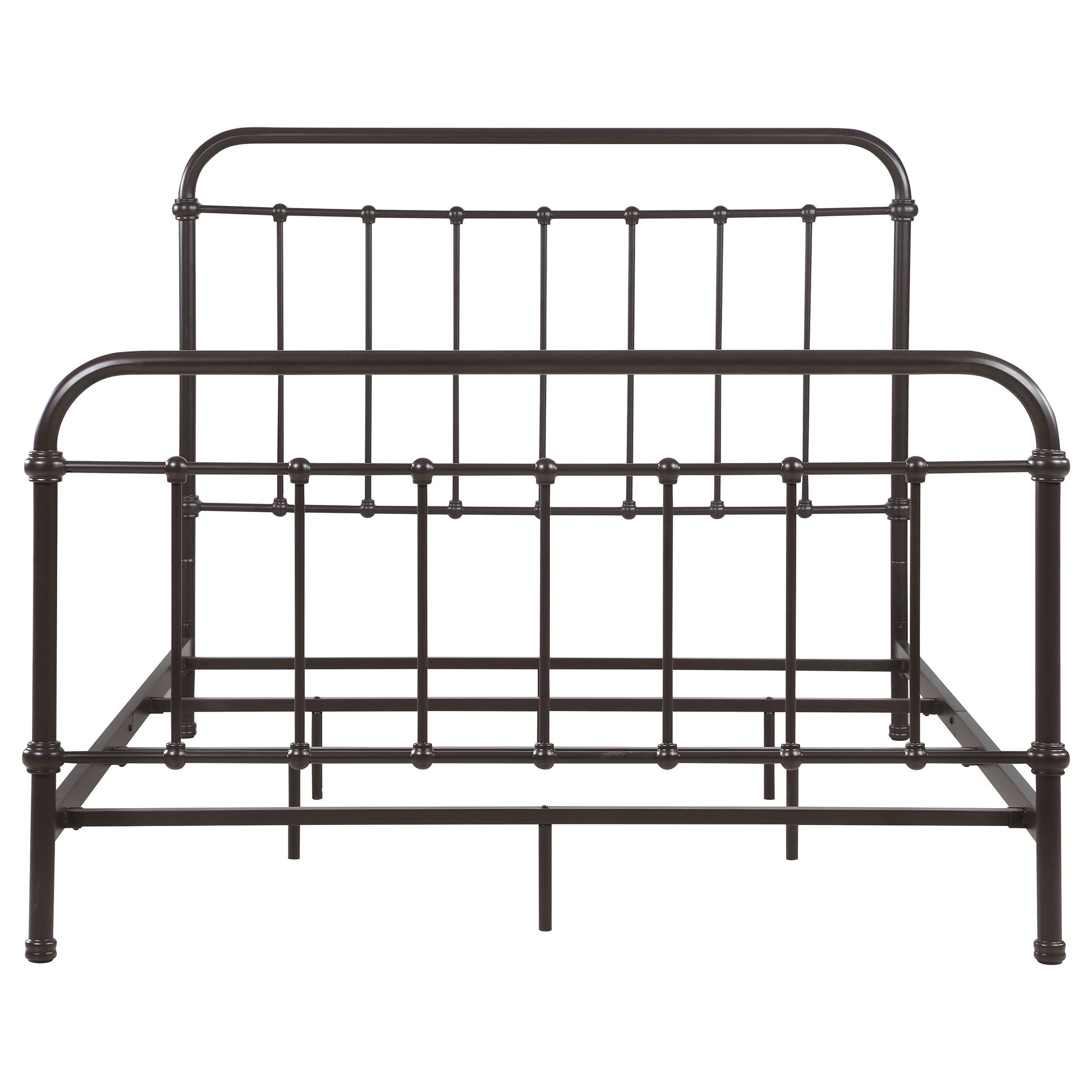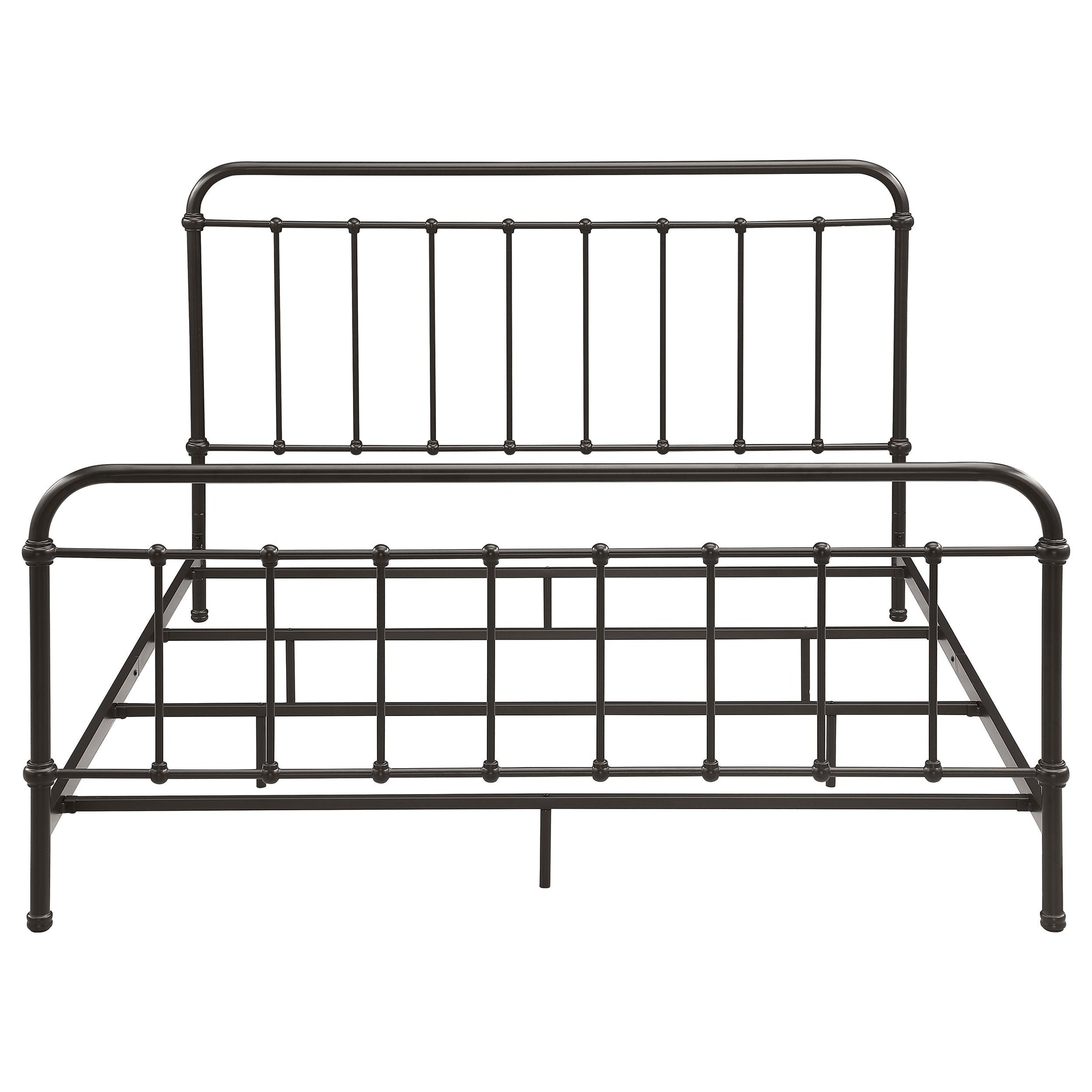Bring vintage-inspired charm to your bedroom with this farmhouse-style metal bed. Designed with a sturdy heavy-gauge metal frame, it features a dark bronze powder-coated finish that enhances its timeless appeal. The headboard and footboard showcase a vertical spindle design with continuous weld construction for added strength and durability. Built for stability and long-lasting use, this bed adds rustic elegance to both modern and classic interiors.