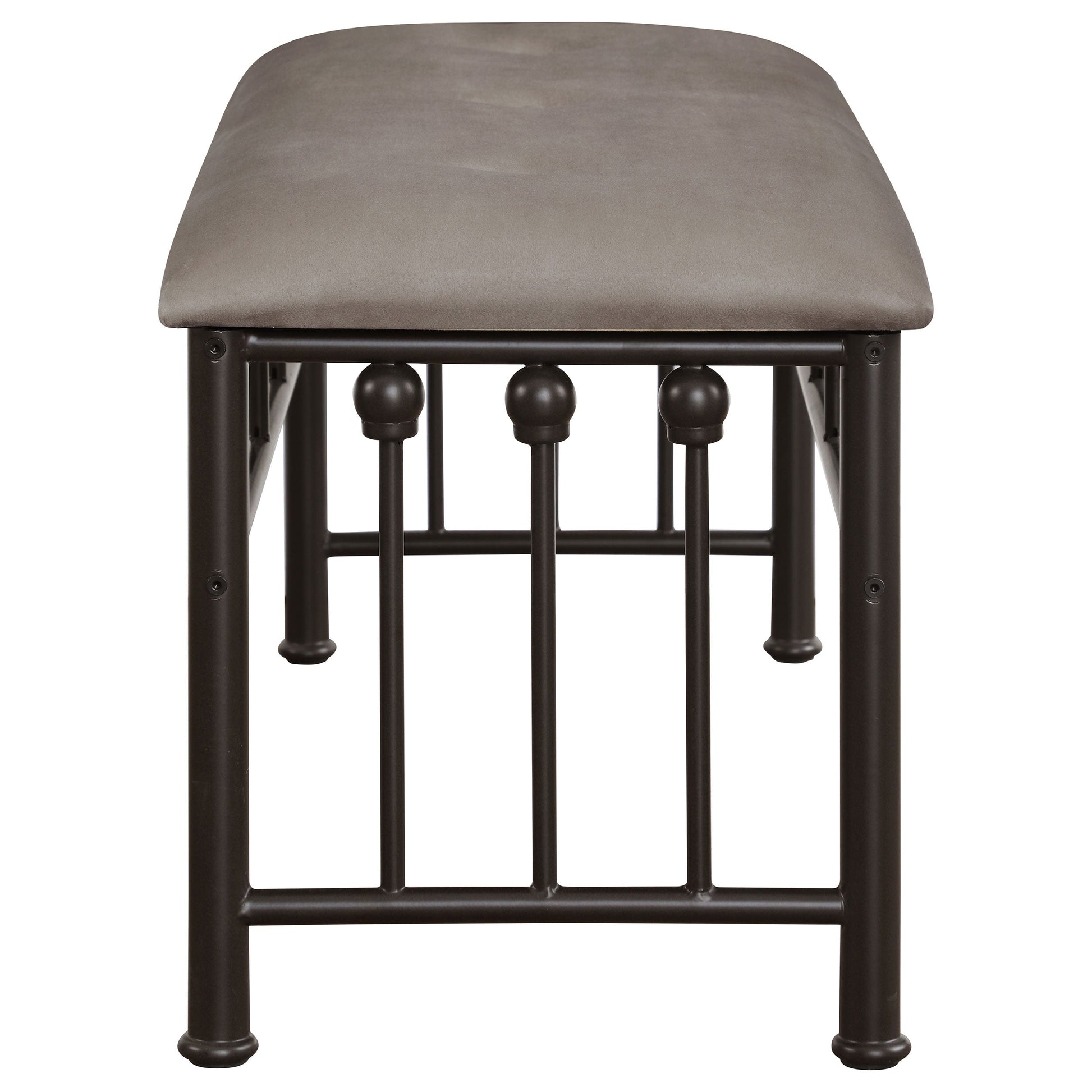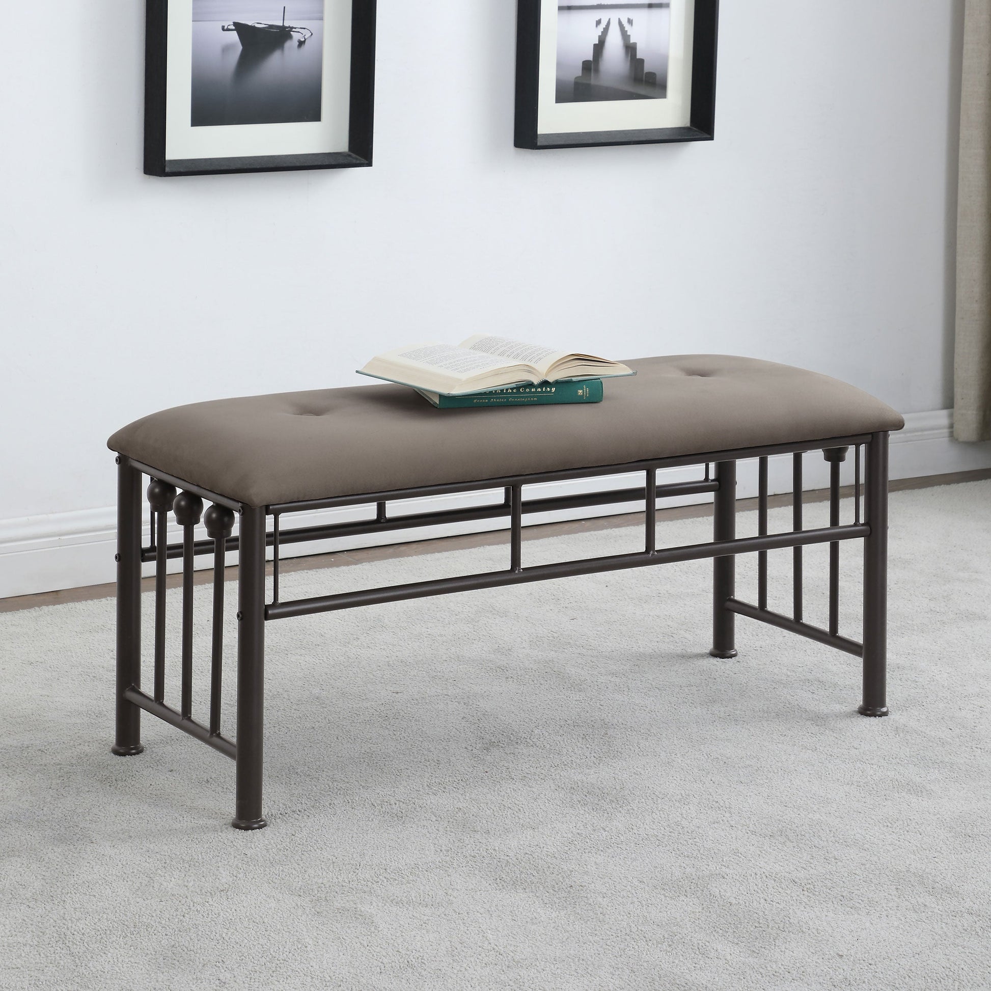 Add versatile seating to your home with this farmhouse-inspired metal bench. Designed with a sturdy dark bronze powder-coated frame, it includes a softly cushioned seat upholstered in brown microfiber for added comfort. Vertical rods and ball accents echo vintage design elements, making it a charming addition at the foot of a bed or in an entryway. Built for everyday use, this bench blends durability with rustic appeal.