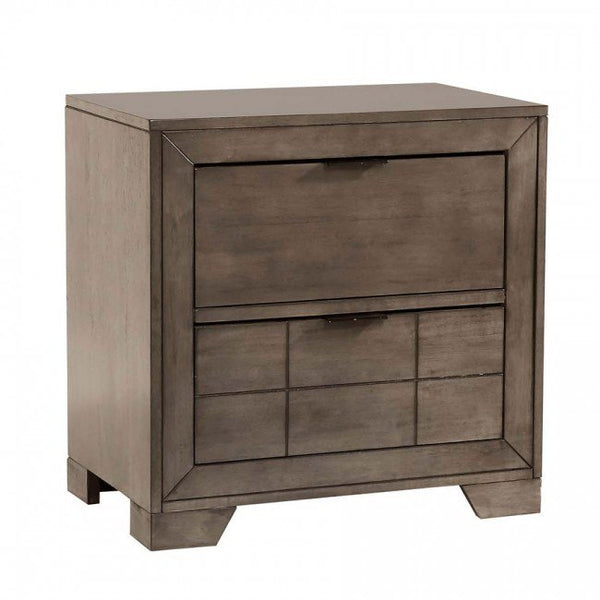 Contemporary design gets a bit of rustic infusion with the Logic Nightstand in Grey. Featuring clean lines and a fun geometrical design, this Logic case piece is the perfect choice for a transitional room. The overall warm rustic grey finish completes the look of this fashionable nightstand. The wooden frame with rubber wood veneer is combined with handle metal hardware in a black finish, and also features a dust proofing bottom layer to keep belongings safe from dirt and debris. Upgrade your space with the Logic Nightstand for a modern style that combines functionality, durability, and elegance.