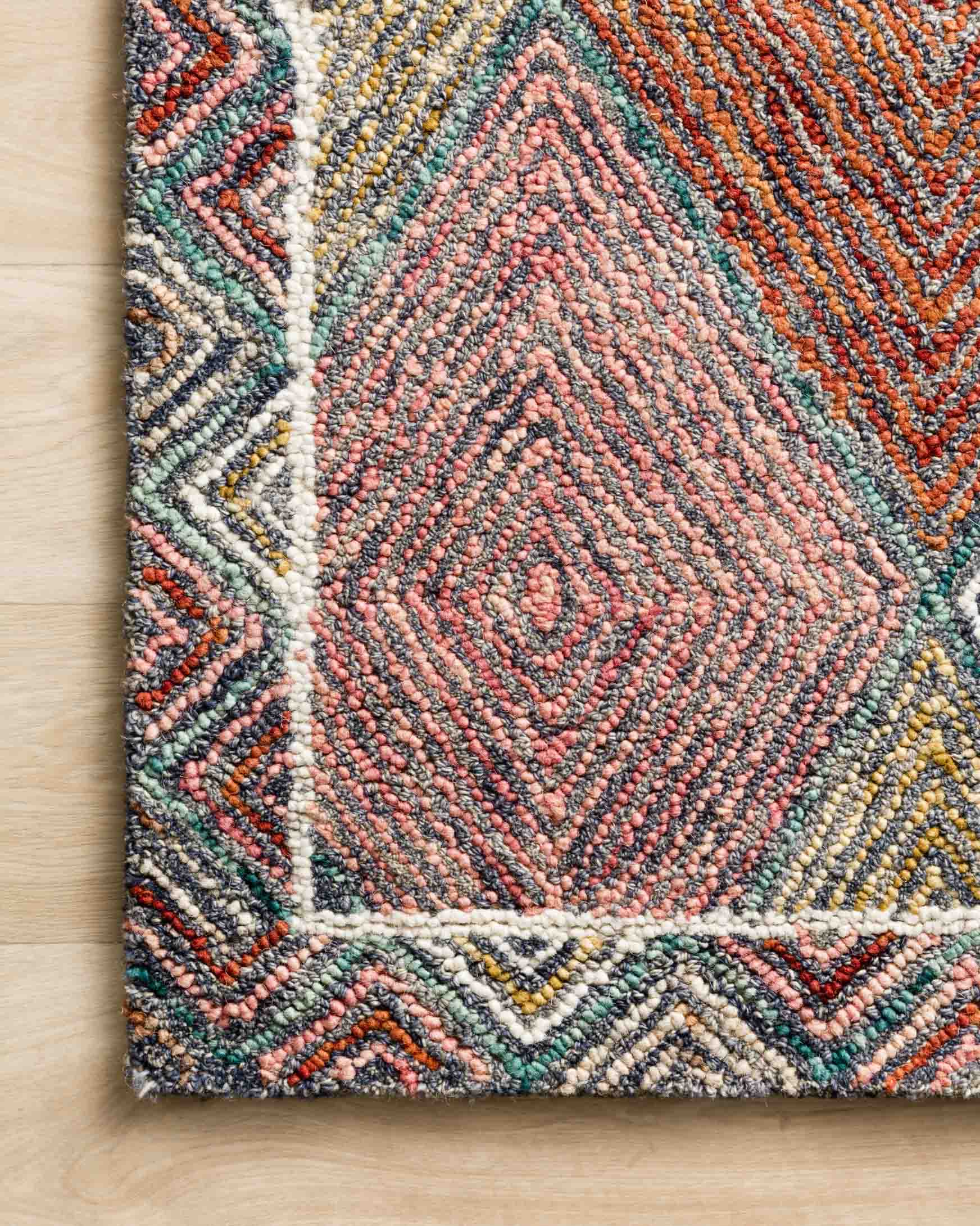 Hooked of wool by artisans in India, The Spectrum collection features vibrant color and texture. Playful and eclectic, this collection is a geometric focal point for any space.