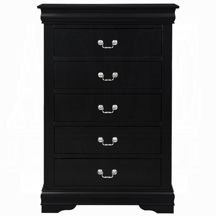 Add timeless sophistication to your bedroom with the Louis Philippe Chest. Finished in rich black and accented with brushed nickel metal hardware, this piece exudes classic charm with a touch of antique elegance. Designed for both style and function, the chest features five spacious drawers, perfect for storing clothing, bedding, and everyday essentials.