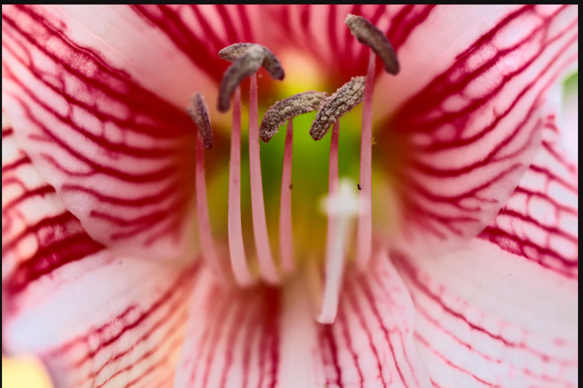 Add a striking botanical focal point to your décor with the Macro Floral Assorted Canvas by Classy Art. Measuring 36" x 48", this large wall canvas captures a dramatic close-up of a flower, highlighting delicate petal textures and vibrant red vertical stripes. The detailed stamens at the center of the bloom draw the eye, creating a visually captivating and elegant piece for any space.