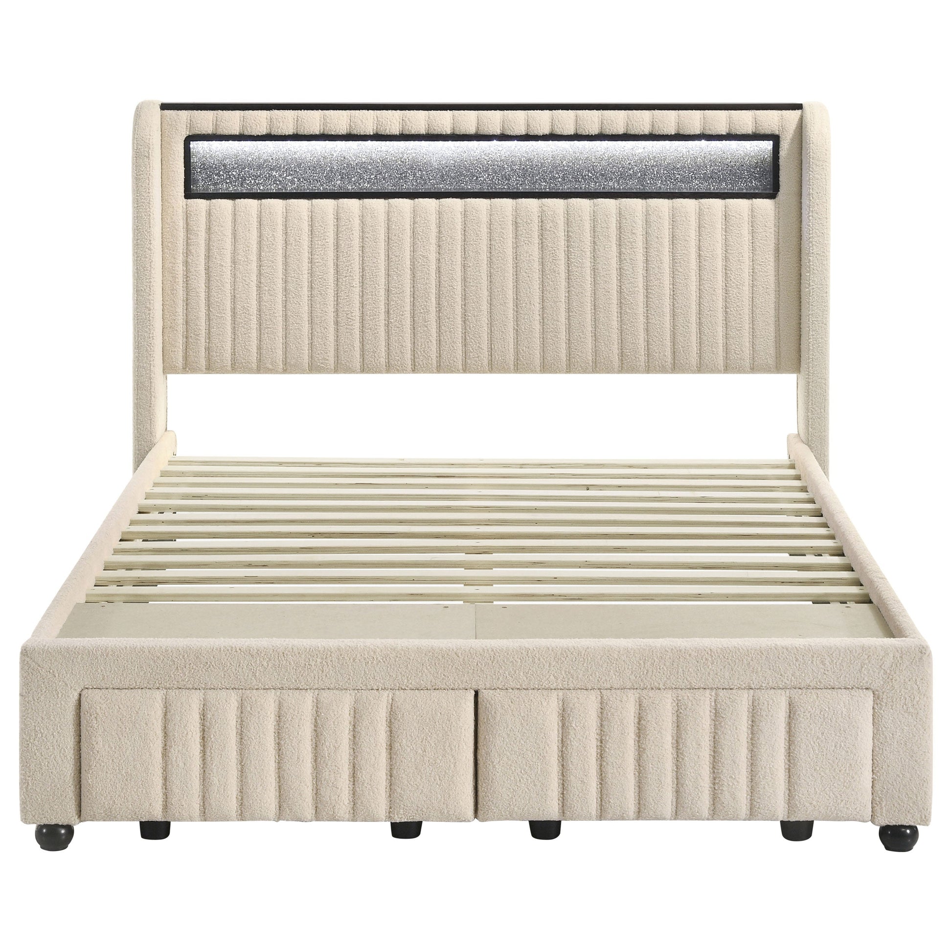 Elevate your bedroom with a modern twist by choosing this chic bouclé upholstered bed. The winged headboard, accented with black welt trim and vertical channel tufting, adds a sleek and sophisticated touch. Featuring a convenient open cubby with a silver backing and white LED touch lighting, it brings a subtle bling effect to your space. The footboard includes a spacious storage drawer, blending style with practical functionality. This bed is perfect for those looking to add a stylish and contemporary flair to their bedroom.
