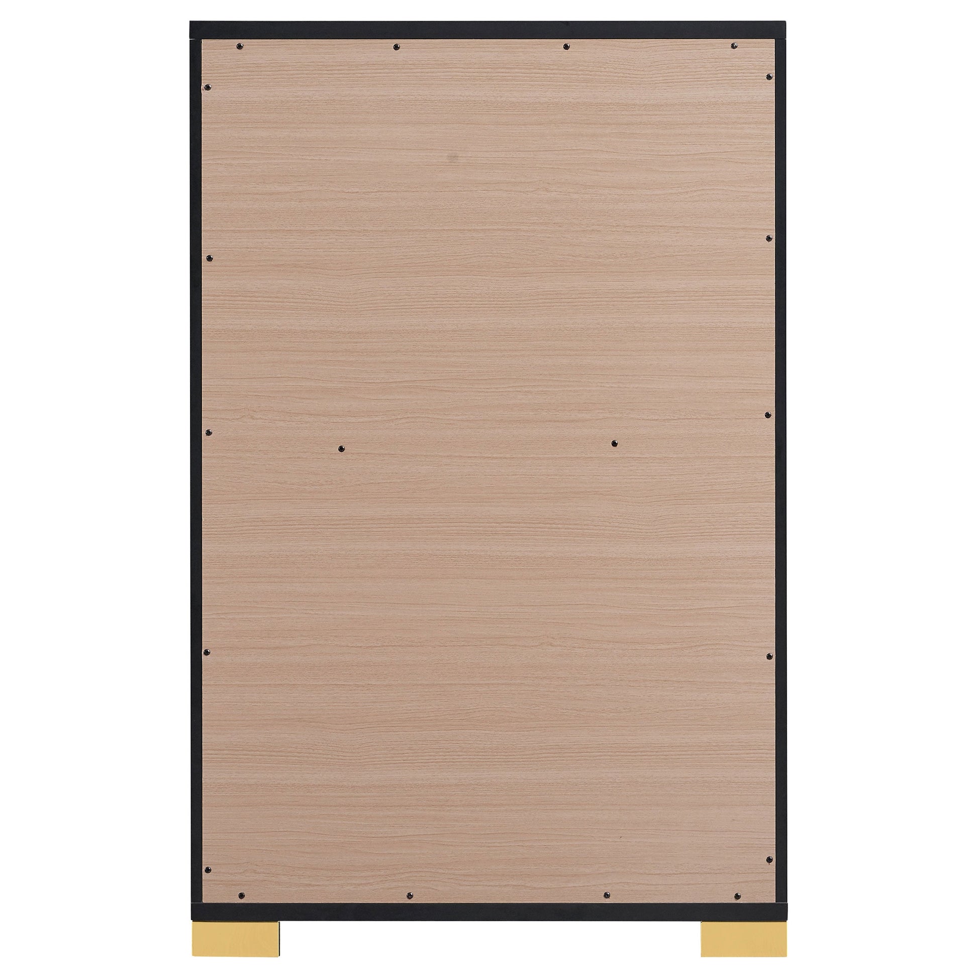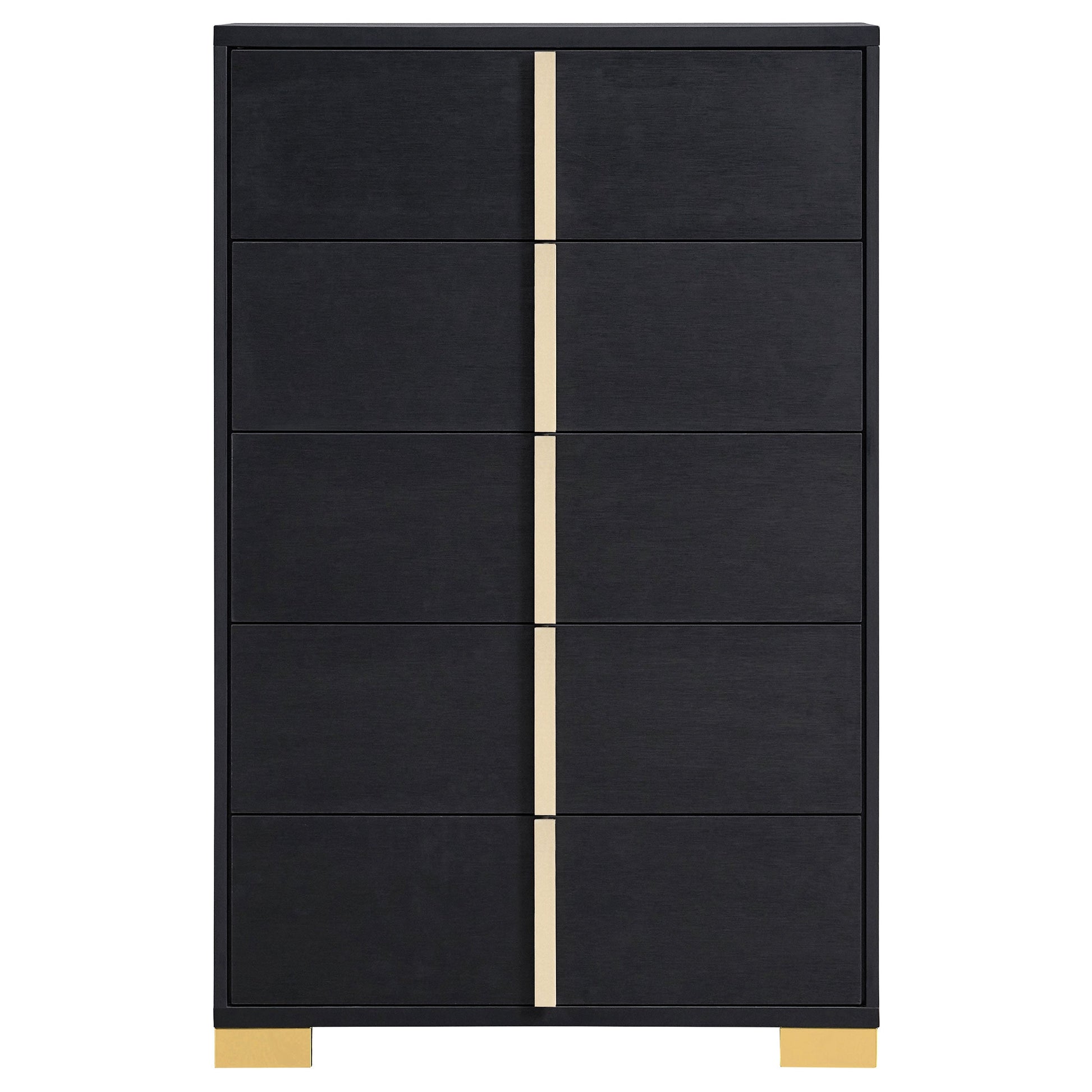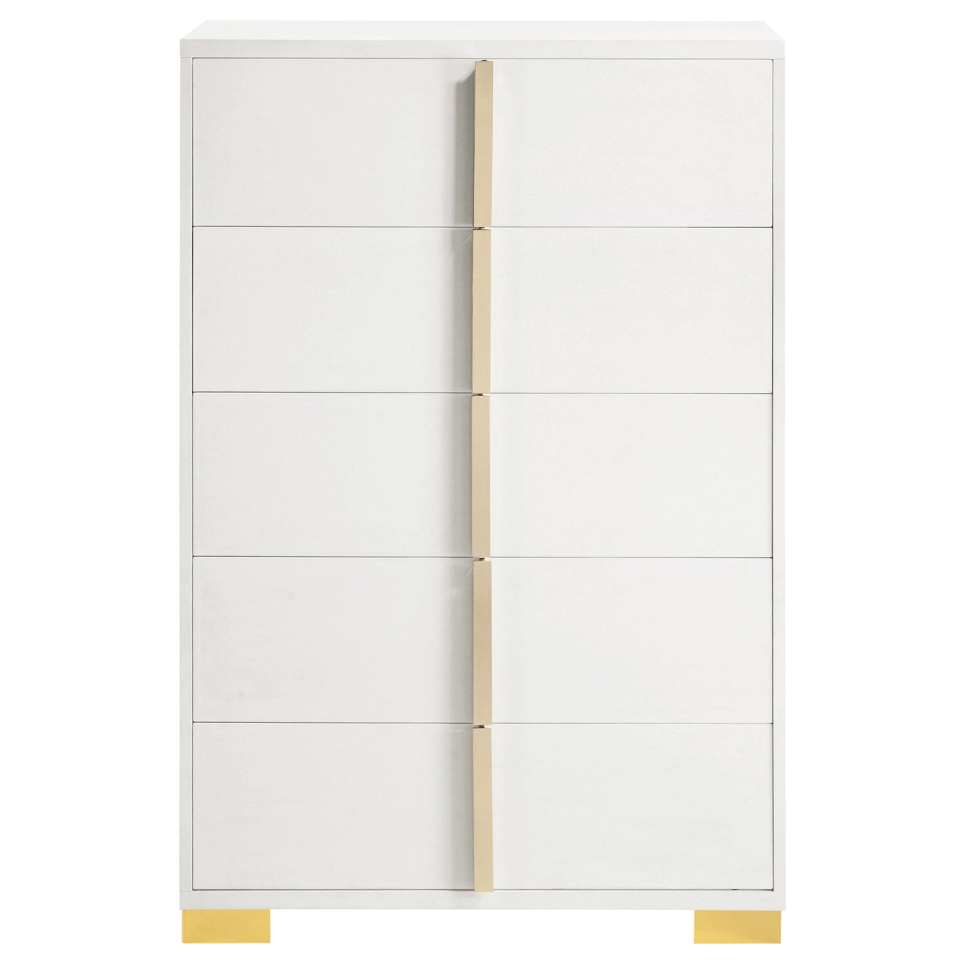 Minimalism never looked so elegant as it does in this elegant five-drawer chest, an excellent option for your updated bedroom ensemble. Modern design details produce a chic vertical chest with an Art Deco vibe and tons of storage space. Made of wood products, this five-drawer chest features a versatile finish with accenting from gold finish metal, placed carefully to emphasize a geometric linear effect. Store incidentals and accessories in drawers operating smoothly on center metal glides. English dovetail drawer construction embellishes this chest’s quality, as vertical gold metal drawer hardware offers a unique impact.