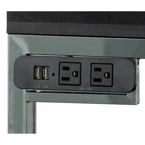 Upgrade your glam space with this sleek and functional vanity set, designed to blend modern elegance with everyday convenience. The set features a spacious mirrored tabletop with two smooth-gliding drawers, perfect for storing makeup, brushes, and beauty essentials. A bold, chrome-finished metal frame with geometric detailing provides sturdy support and stylish flair. The centerpiece is the large mirror framed by Hollywood-style bulbs for bright, flattering lighting—ideal for precise makeup application. Built-in power outlets on the side add practical convenience for plugging in hair tools or charging devices. The matching cushioned stool completes the set, offering both comfort and style.