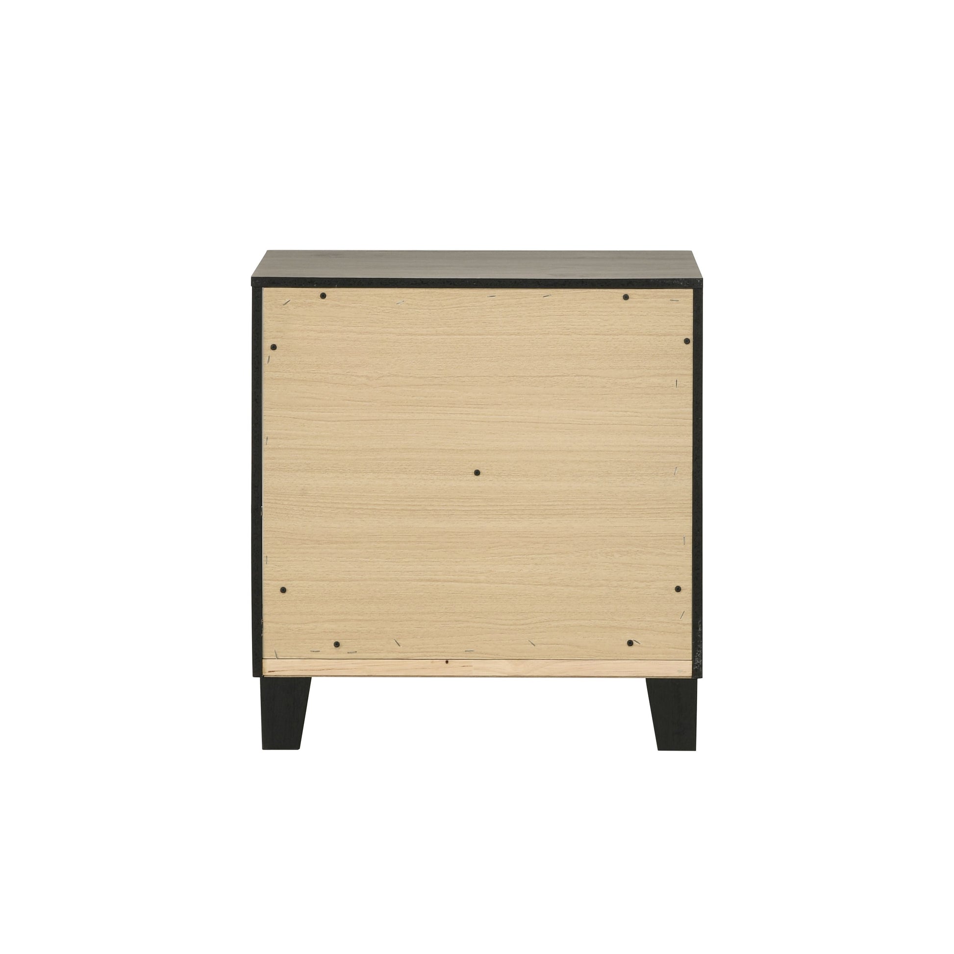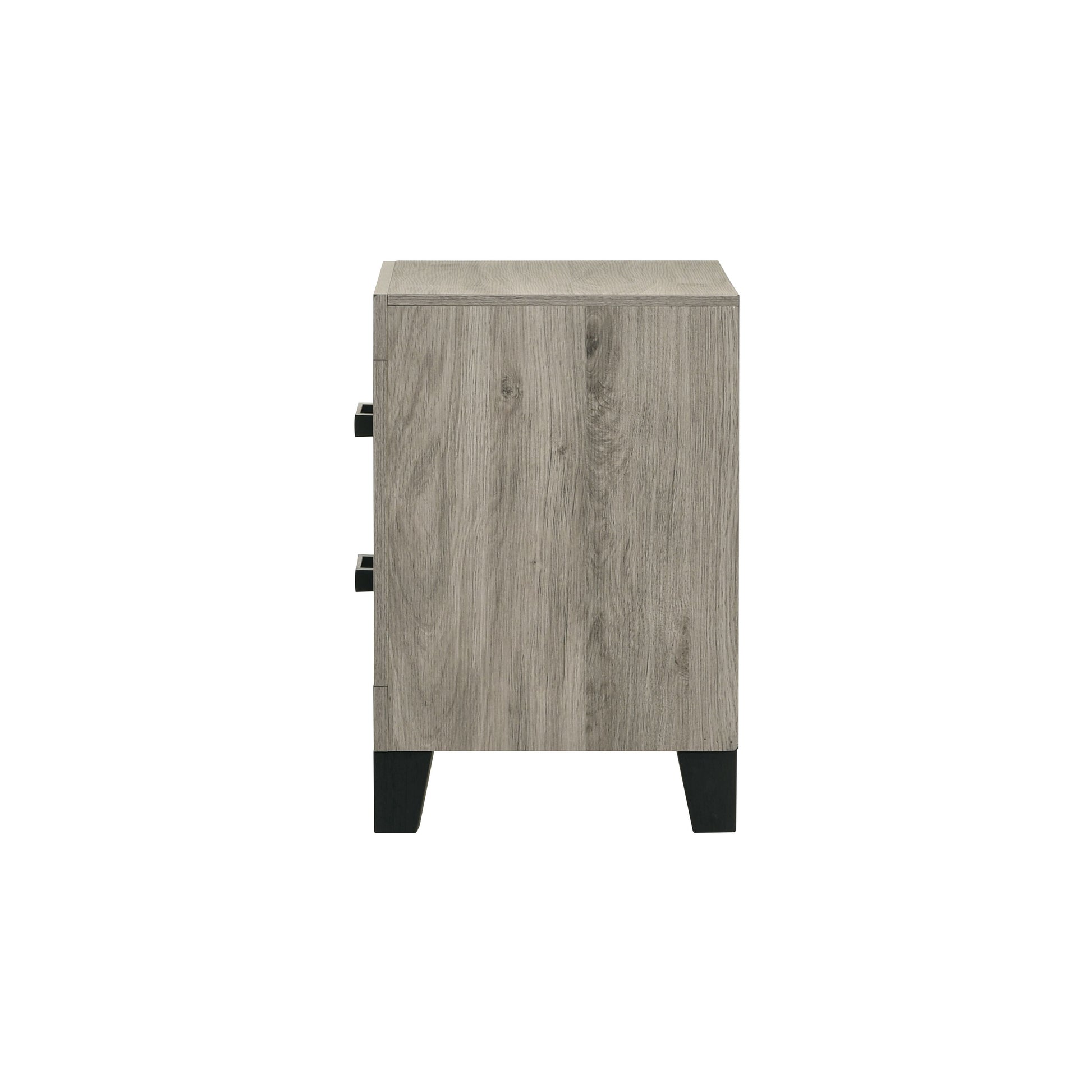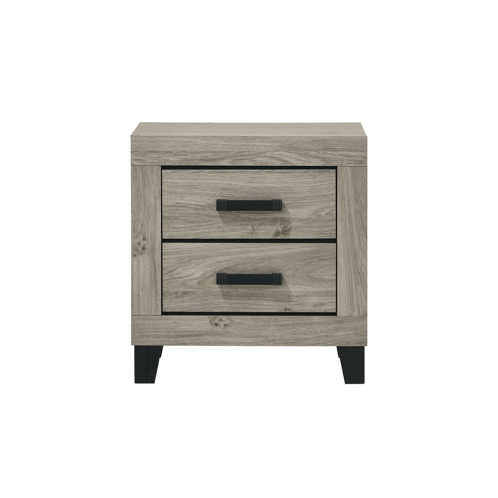 A fresh take on farmhouse design the Mari bedroom collection offers a sleek transitional design aesthetic. The bedroom set is finished in a stylish light gray with black accents that can appease anyone. The bed features a chevron-paneled headboard and sits on black wooden legs. All the casegoods offer storage drawers with contrasting black metal pulls and sit on black wooden legs to match the bed. The dresser mirror is encased in a wooden frame to match the dresser.