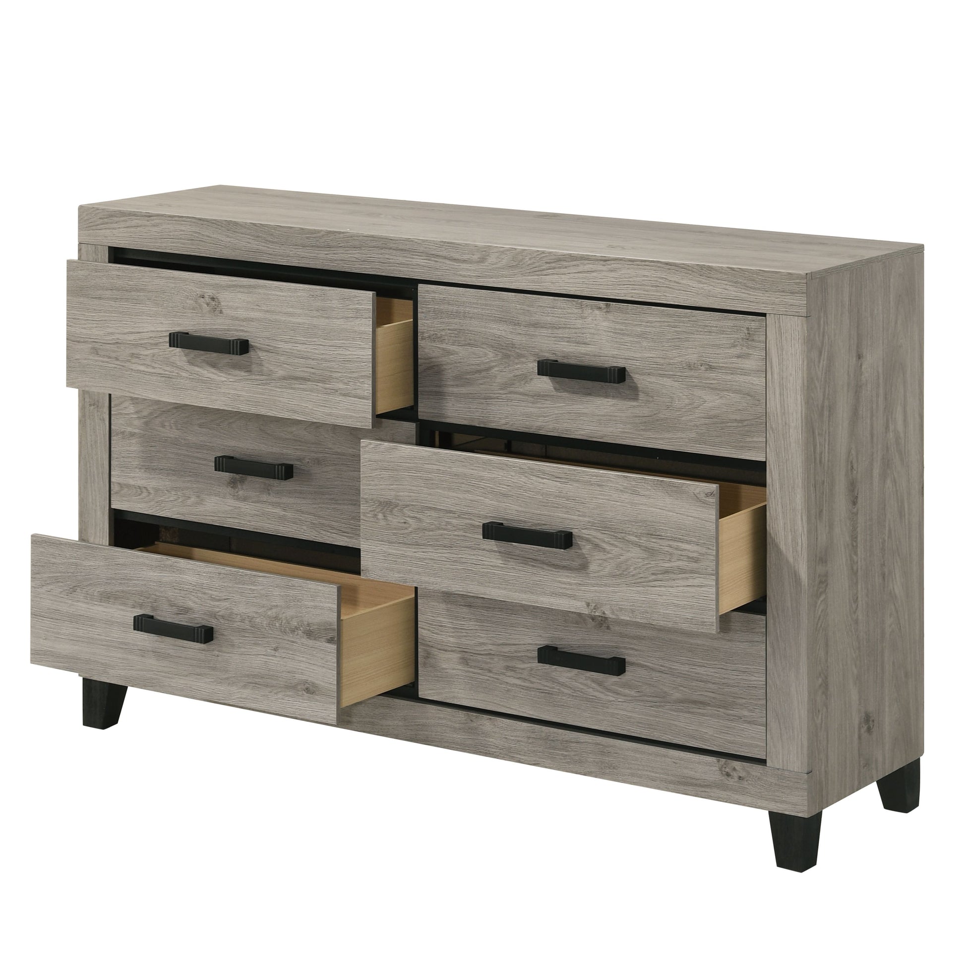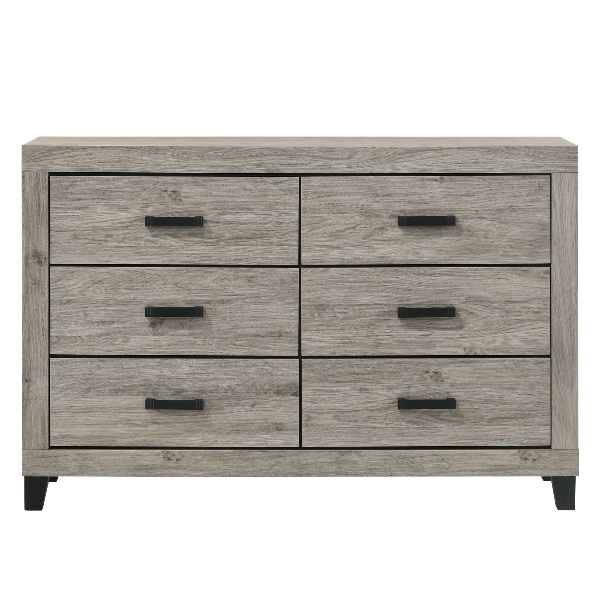 A fresh take on farmhouse design the Mari bedroom collection offers a sleek transitional design aesthetic. The bedroom set is finished in a stylish light gray with black accents that can appease anyone. The bed features a chevron-paneled headboard and sits on black wooden legs. All the casegoods offer storage drawers with contrasting black metal pulls and sit on black wooden legs to match the bed. The dresser mirror is encased in a wooden frame to match the dresser.