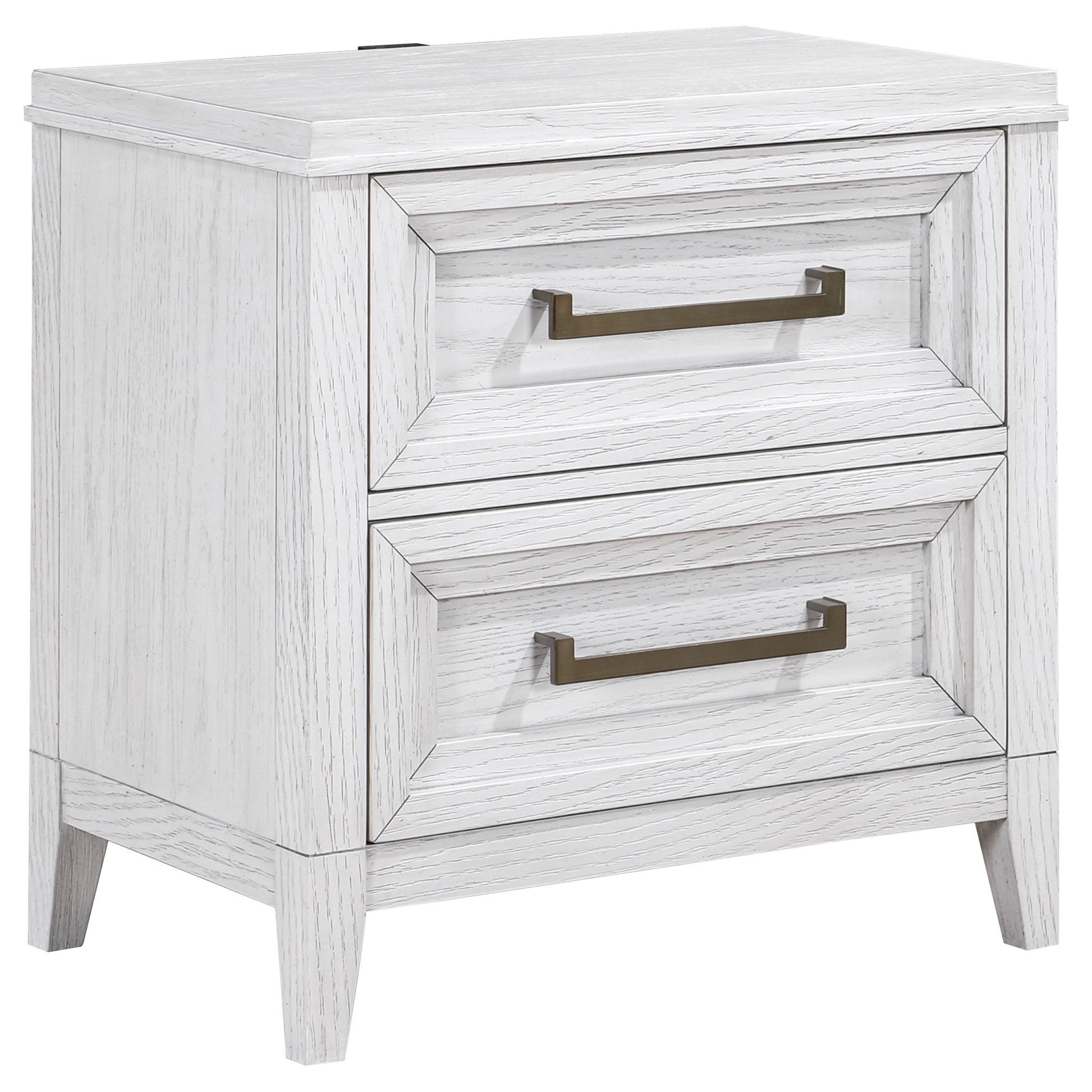 Distressed white finish highlights wood grain details and bar hardware to create texture and depth