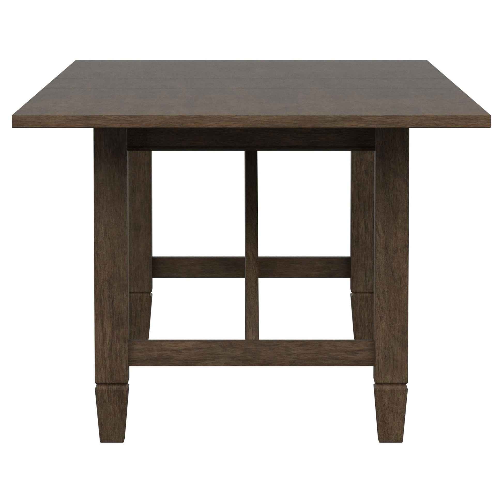 Create a soothing, relaxed ambiance in your welcoming dining room with a transitional five-piece dining set. The set centers on a rectangular table crafted in Asian hardwoods and graced with a warm, neutral brown finish. Angular support details add trestle-inspired style for a hint of farmhouse flair to the table, which includes an extension leaf for guests. Four side chairs are included, each boasting a matching wooden frame with a plush padded seat in neutral beige upholstery. Rectangular seat backs add rattan, bringing airy appeal and casual character in a kitchen or dining room.