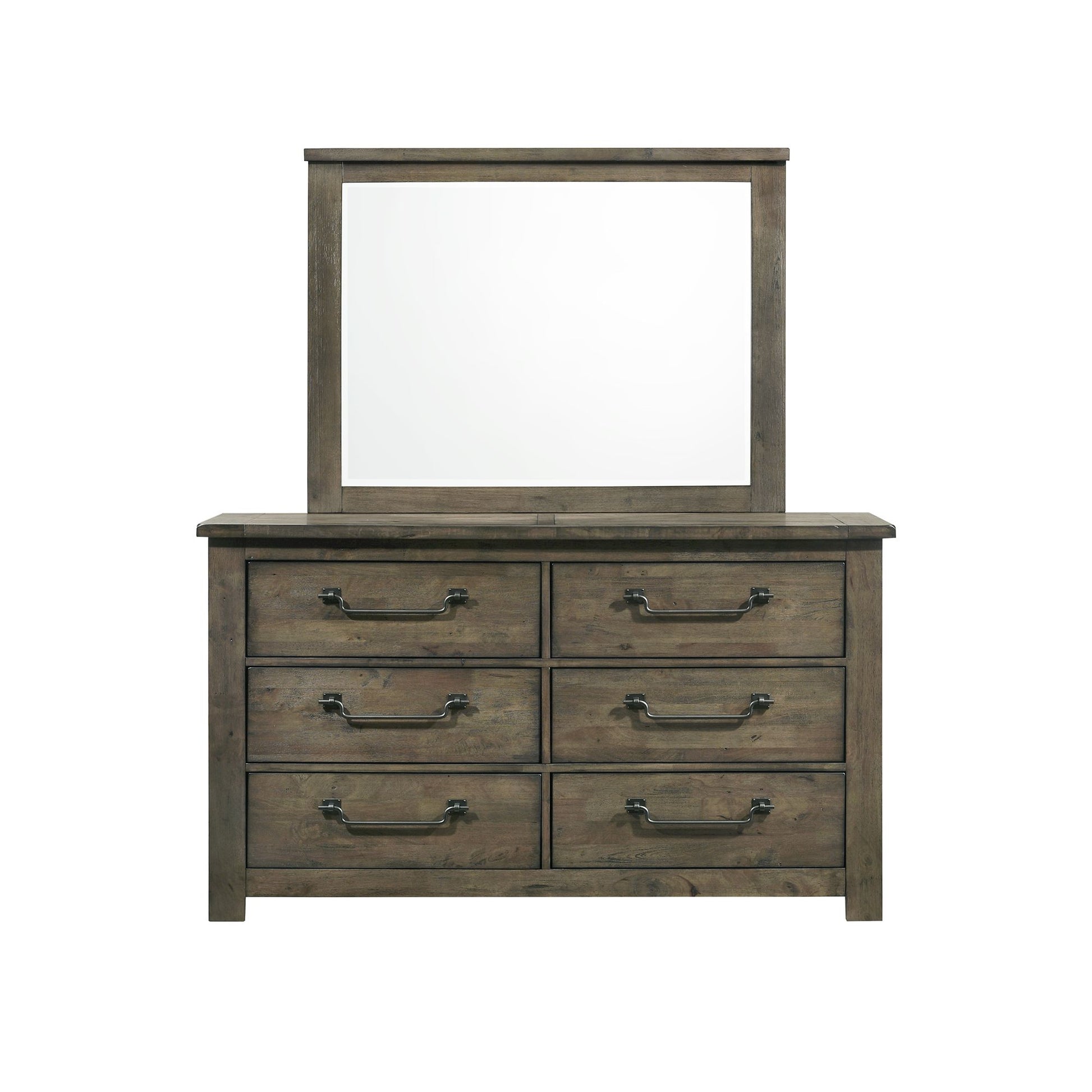 The Maverick 6-Drawer Dresser with Mirror in Grey delivers rustic and cozy style to your sleeping space. Features distressing and wood grain detailing throughout for that warm feel. Constructed of sturdy solid and manufactured woods for years of use. Perfect neutral finish for adding to your existing bedroom aesthetic. Complete the look by adding the Maverick Panel Bed to your bedroom.