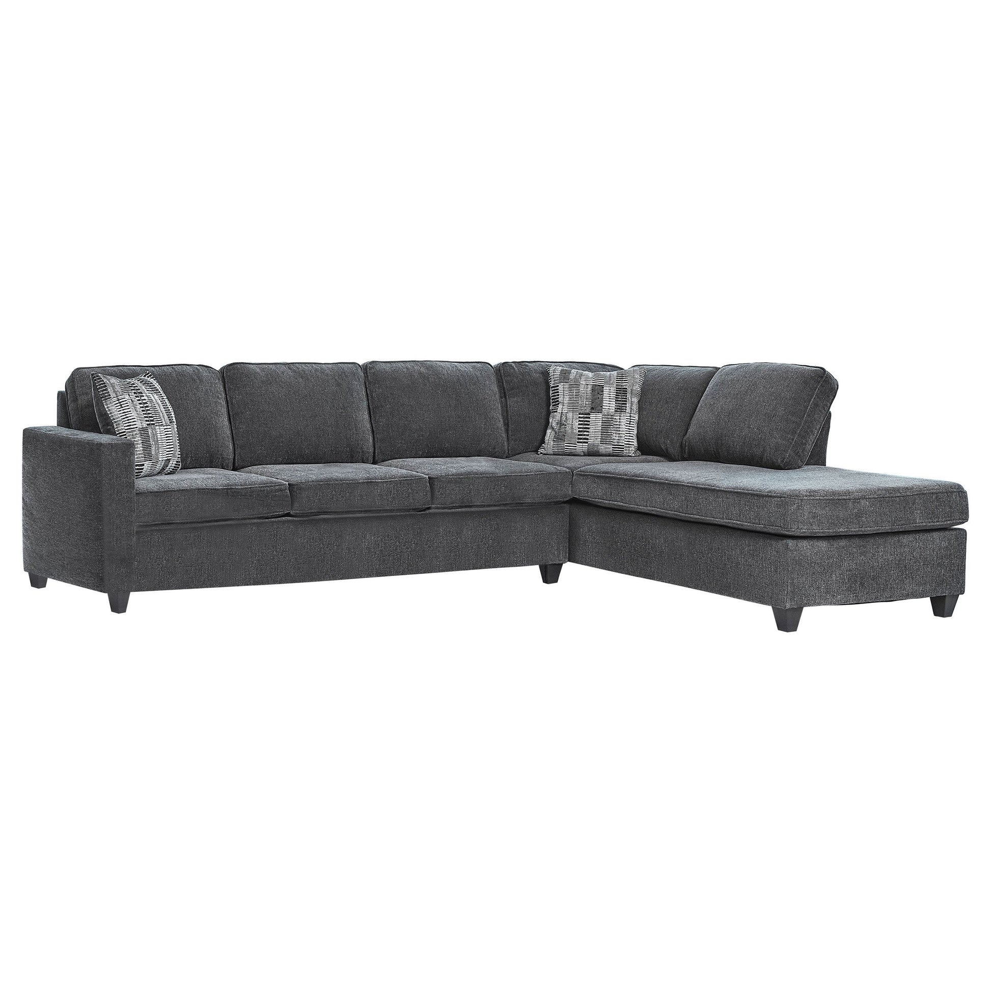Enjoy a new family favorite for your living room, den, or entertainment room. This reversible 2-piece transitional sectional is a handsome addition to your home. Lounge in comfort on the plush dark grey chenille fabric seat and back cushions and rest your elbows on the armrests, all accented with self-welt details. Extra throw pillows come included for those occasions when a nap is necessary. For convenience, the reversible spacious chaise is perfect to recline on, and the dark brown tall tapered legs give the sectional added height.