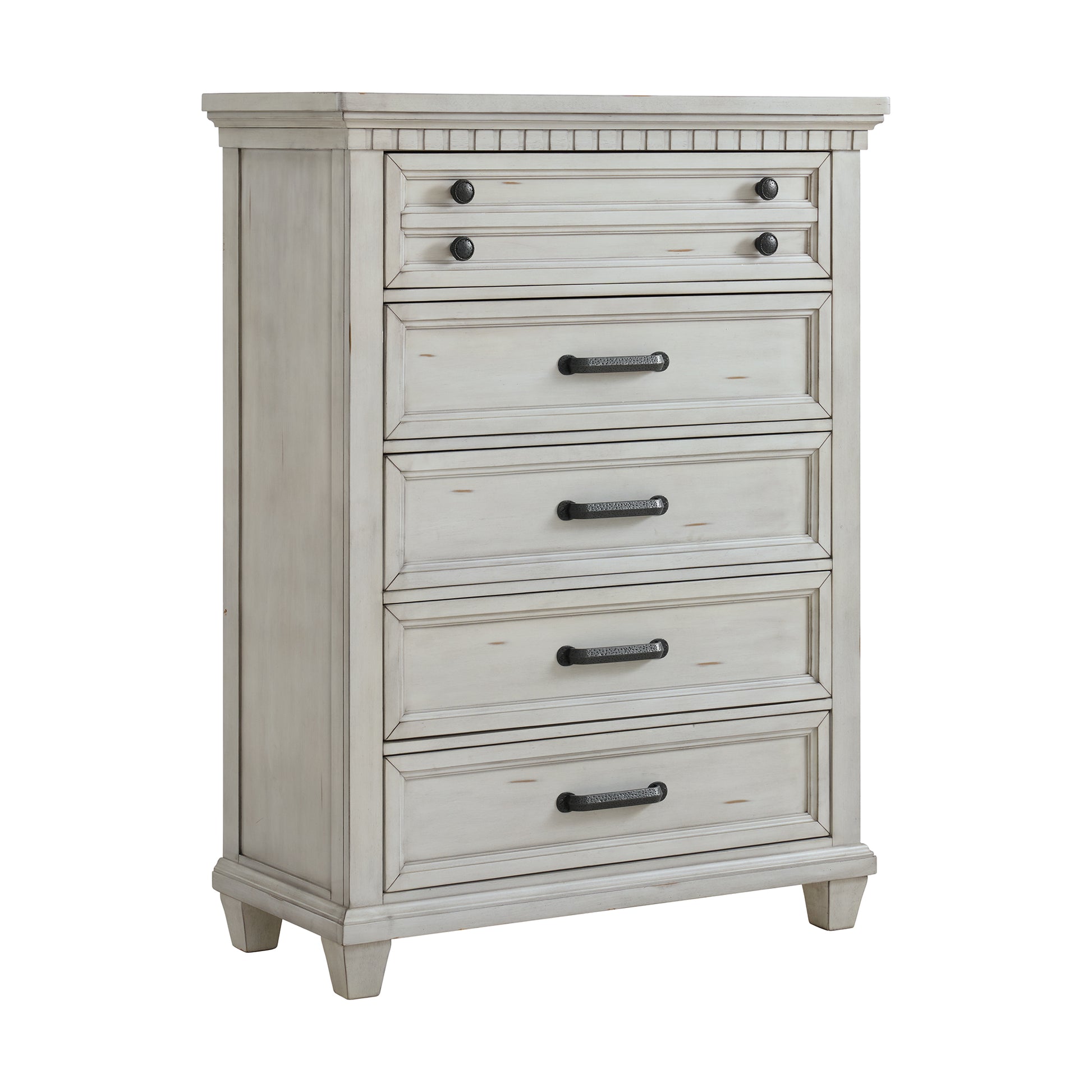 The McCoy King Storage 5PC Bedroom Set will look fantastic in your bedroom! This set comes with the perfect combination of bed, dresser with mirror, chest and nightstand. The high profile headboard features an inset panel design, while the footboard comes with storage drawers perfect for storing away extra bed linens or blankets. The nightstand comes with a USB port, letting you keep your devices charged while you sleep. The nightstand, chest, and dresser all come with hidden drawers that are perfect for storing away any valuables you want to keep hidden. Beautiful details such as bevel edges and dental molding along the top front edges are featured throughout the collection. This set is finished in an antique white and makes it a perfect bedroom staple for years to come.