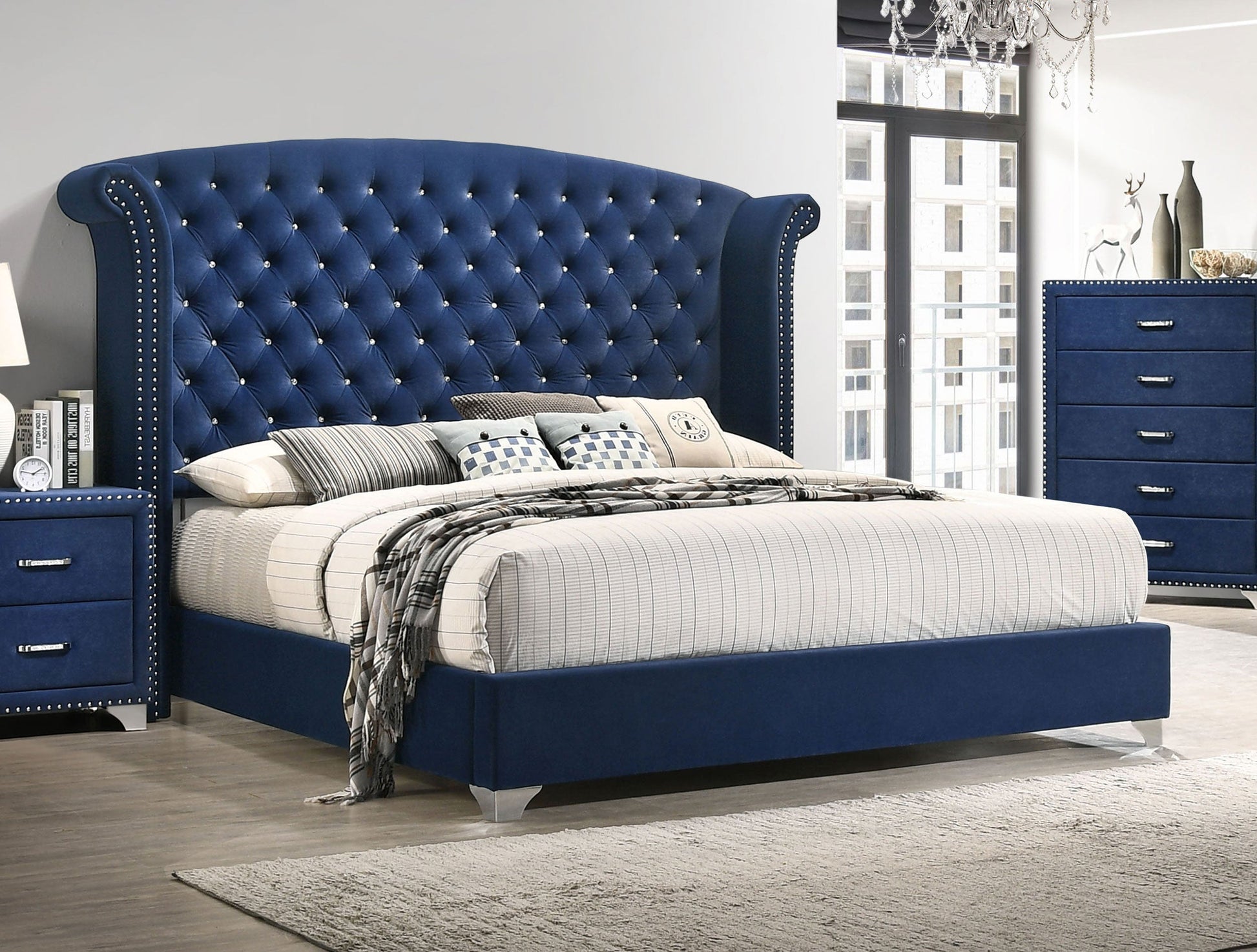 Every morning you'll wake up like you're living in a castle with this exquisite traditional style upholstered bed. An elegantly dramatic wingback style headboard makes a stunning focal point in your sleeping space. Adorned with nail head trim and button tufting, the velvet is luxuriously soft to the touch. This bed is supported on a low profile with sleek silver chrome legs. Regal and plush, this piece is the epitome of style and function.