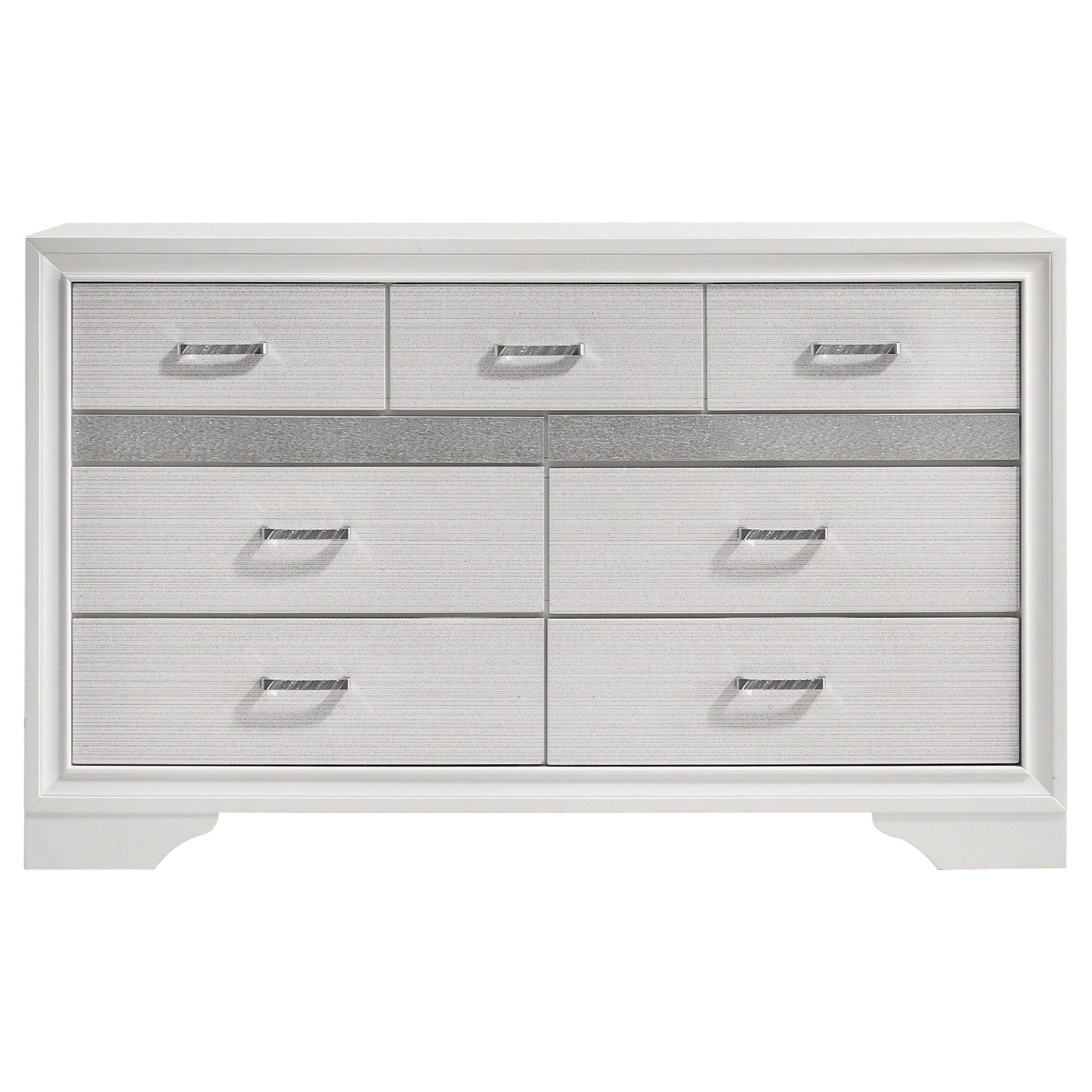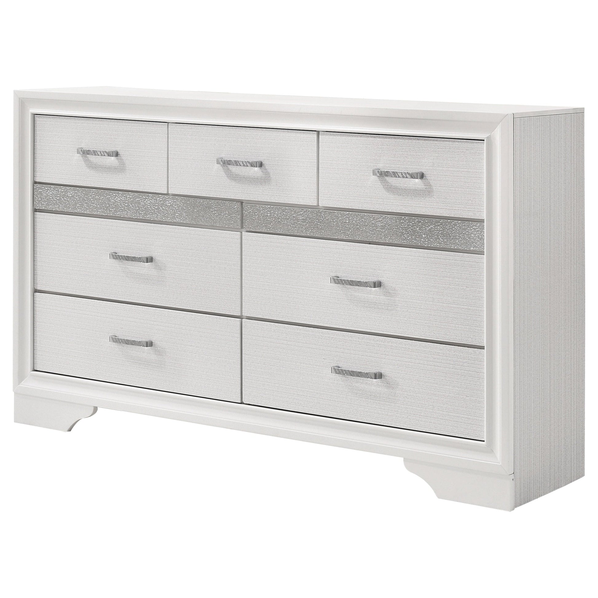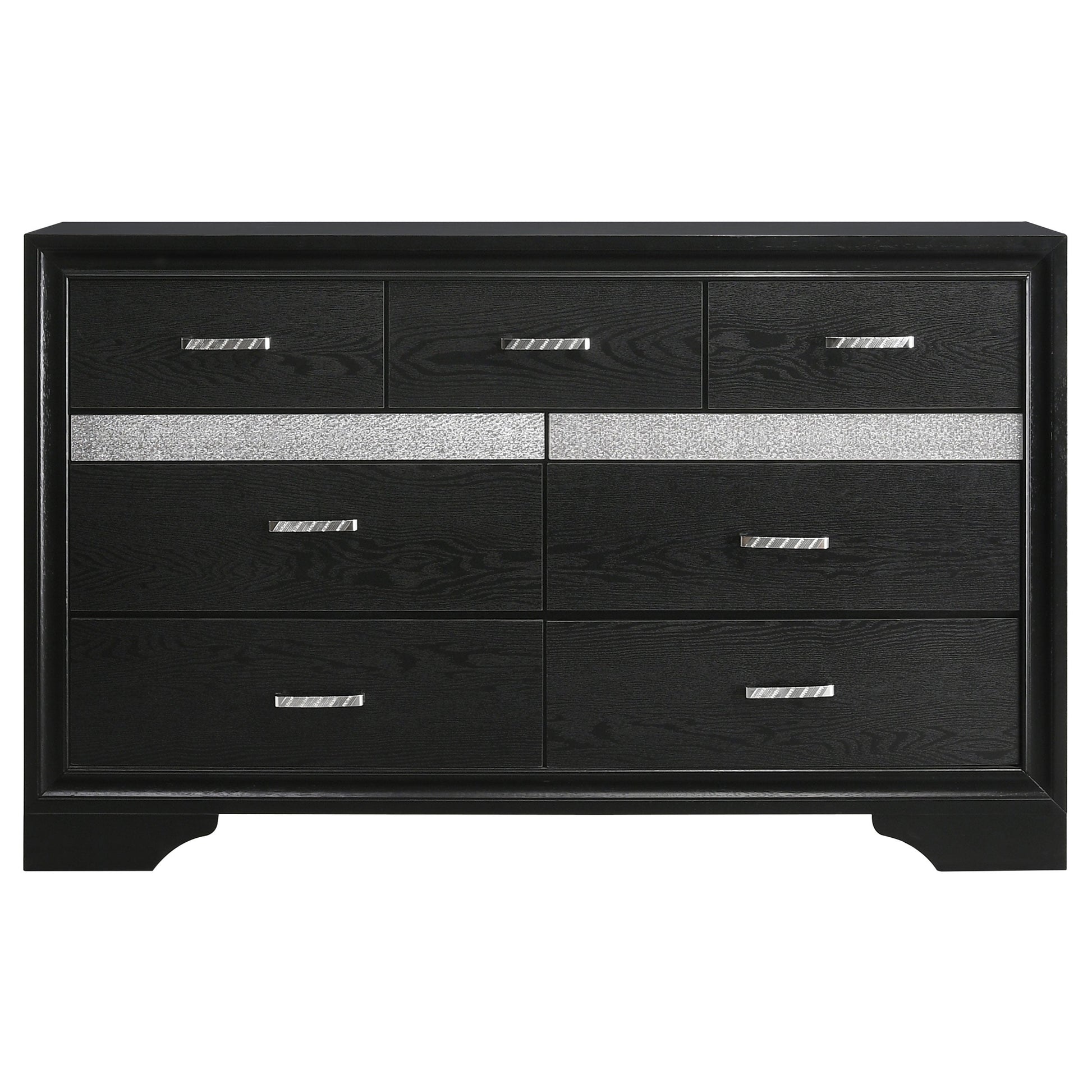 Infuse your space with sophisticated grace. The chic design of this beautiful dresser lends a touch of elegance to any bedroom. Felt-lined drawers keep delicate belongings safe and secure. A hidden jewelry drawer offers a discreet place to store your valuables. Complete with a glittery panel across the front, this piece exudes sparkling opulence.