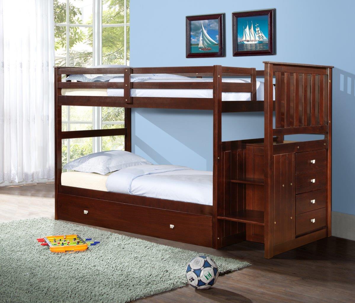 The twin over twin Mission stairway bunk bed adds a warm look to any bedroom with the Mission headboard panels and warm cappuccino finish. The 4-drawer chest is a perfect space saver in any room and can be assembled on either end. The twin roll out trundle is perfect for overnight guests. This Donco Kids product will give your child years of enjoyment. Donco provides many different styles and colors to choose from.