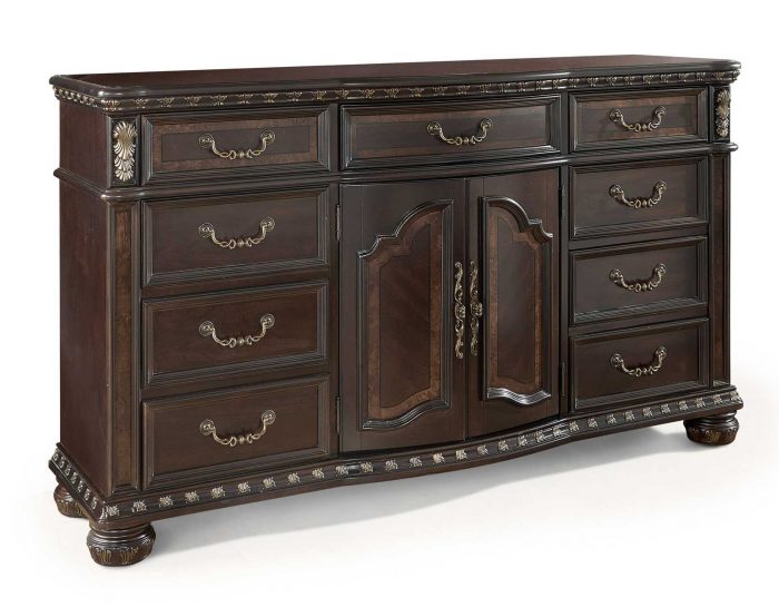 Large-scaled yet romantic bedroom collection from Steve Silver Company. Poster bed is available in king or queen sizes and is complemented by several options in storage pieces. Crafted from cherry and mappa burl veneers and poplar solids, Monte Carlo features a multi-step rich, lustrous cocoa finish