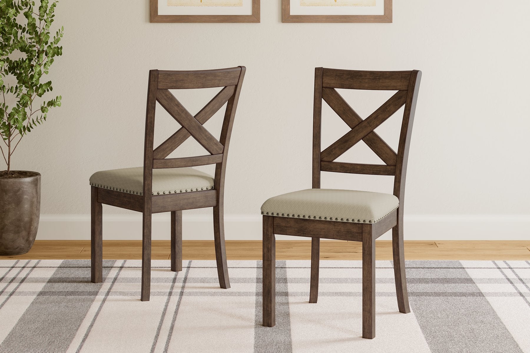 This upholstered dining chair elevates the art of casual rustic style. With a distressed nutmeg finish, antiqued nailhead trim and textured polyester fabric, this upholstered dining chair with classic X back styling entices with warmth and earthy elegance. Cushioned seat accommodates lingering meals enjoyed in comfort.