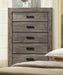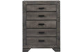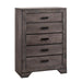 The Nathan 5-drawer Chest is what rustic farmhouse dreams are made of! This vertical chest comes with five, spacious drawers; perfect for keeping all of your belongings neatly stored away. The top drawer is felt-lined and is a great spot to keep your more delicate items. The bottom drawer features a dust proofing layer to help protect your belongings. The weathered, gray oak finish pairs beautifully with the rustic metal drawer pulls. Sleek, clean lines and bracket feet complete the look of this rustic, chest of drawers.