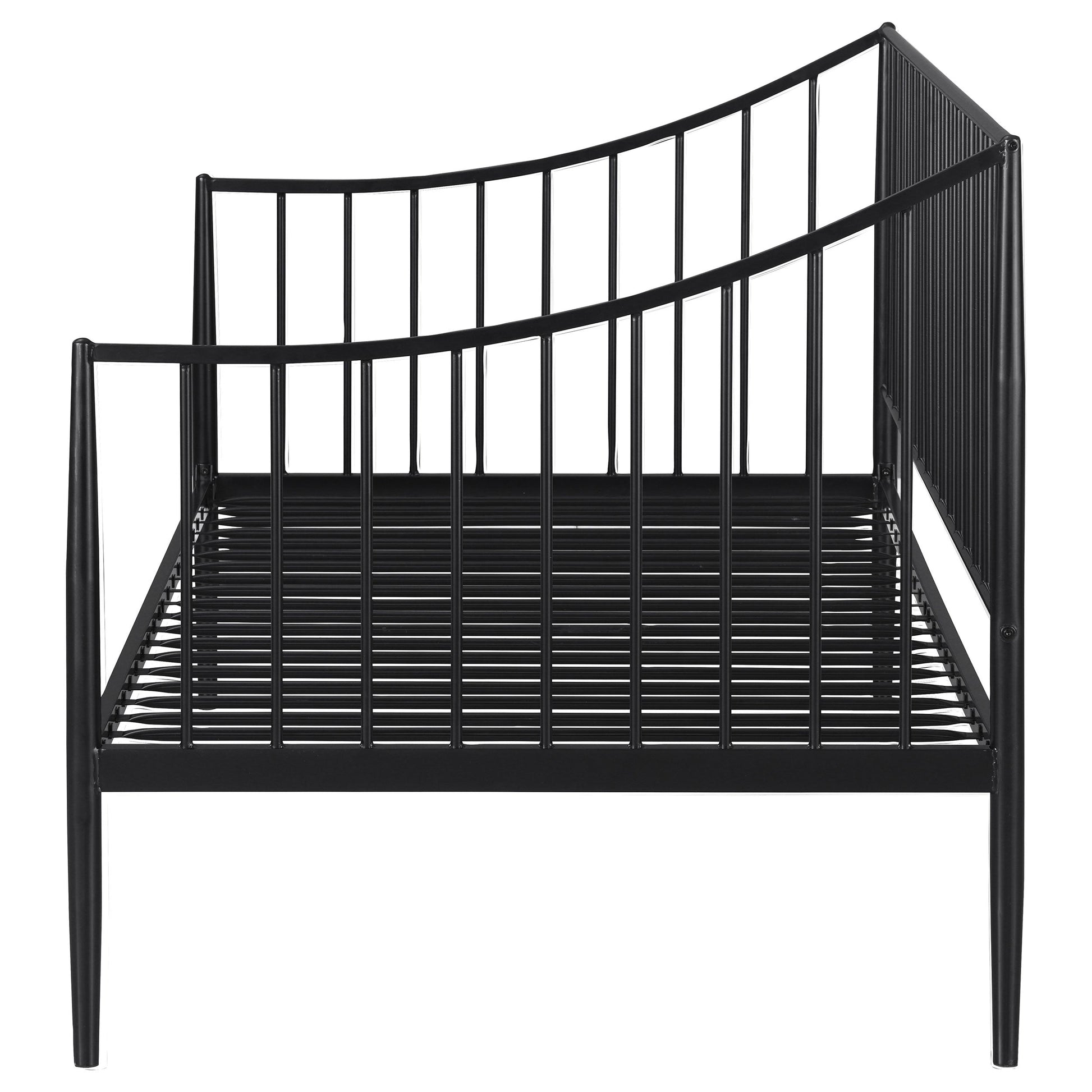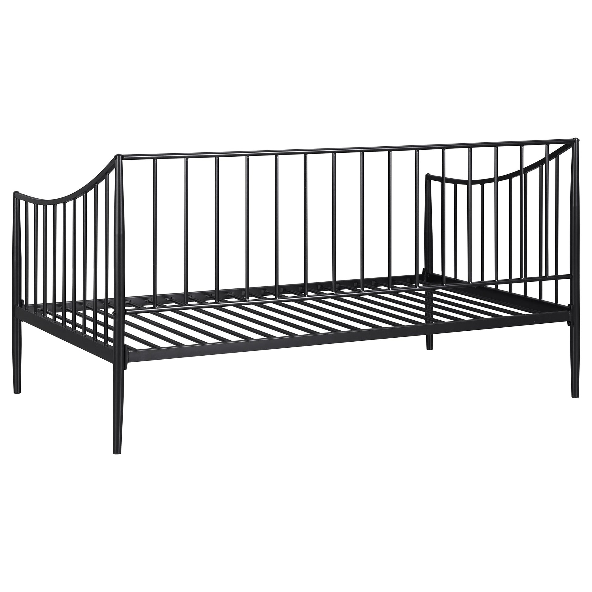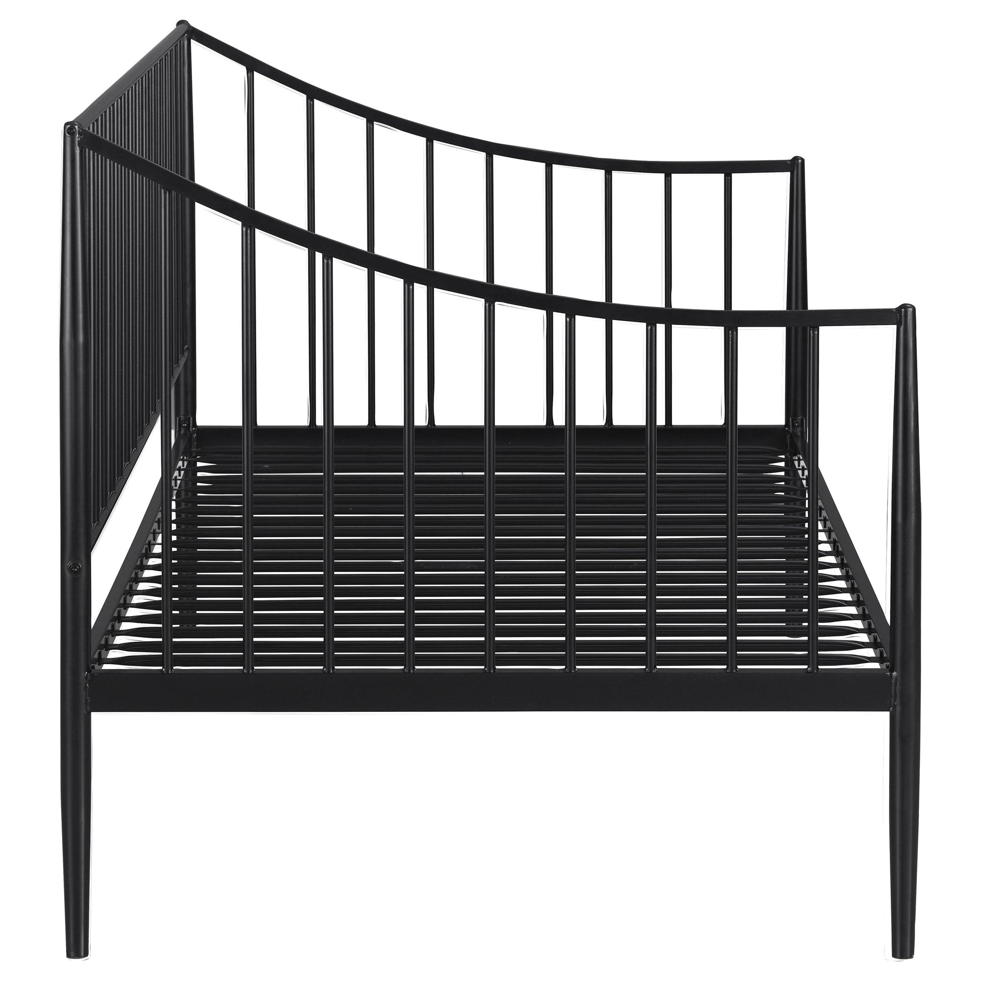 This stylish daybed offers a sleek and practical solution for guestrooms, living rooms, or compact spaces. Constructed from welded metal, it ensures lasting durability and stability. The powder-coated matte black finish enhances its modern, minimalist aesthetic while protecting against wear. Featuring a slatted metal platform, it provides reliable support for a twin mattress without the need for a box spring. Its streamlined design blends seamlessly into various settings, combining functionality with contemporary style.
