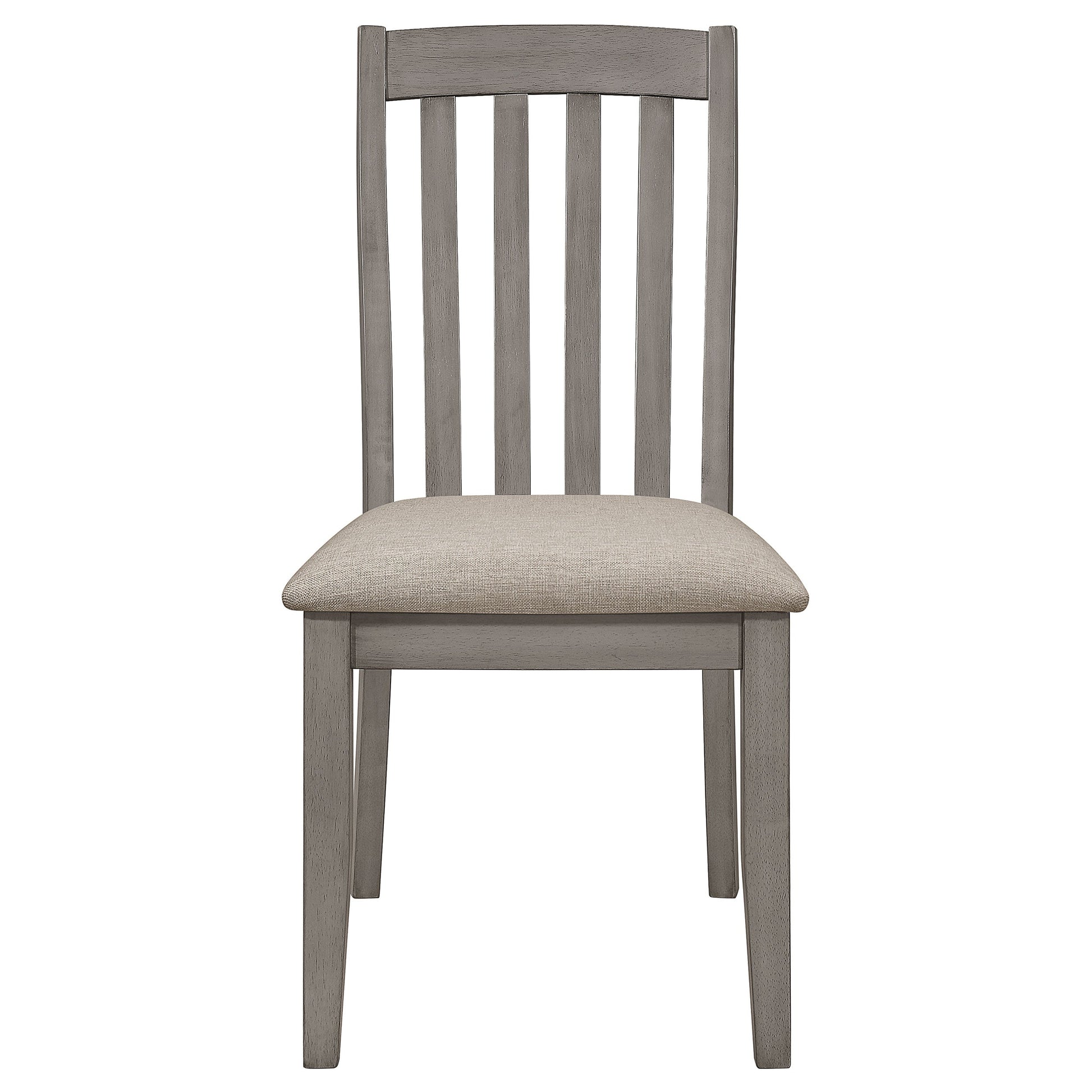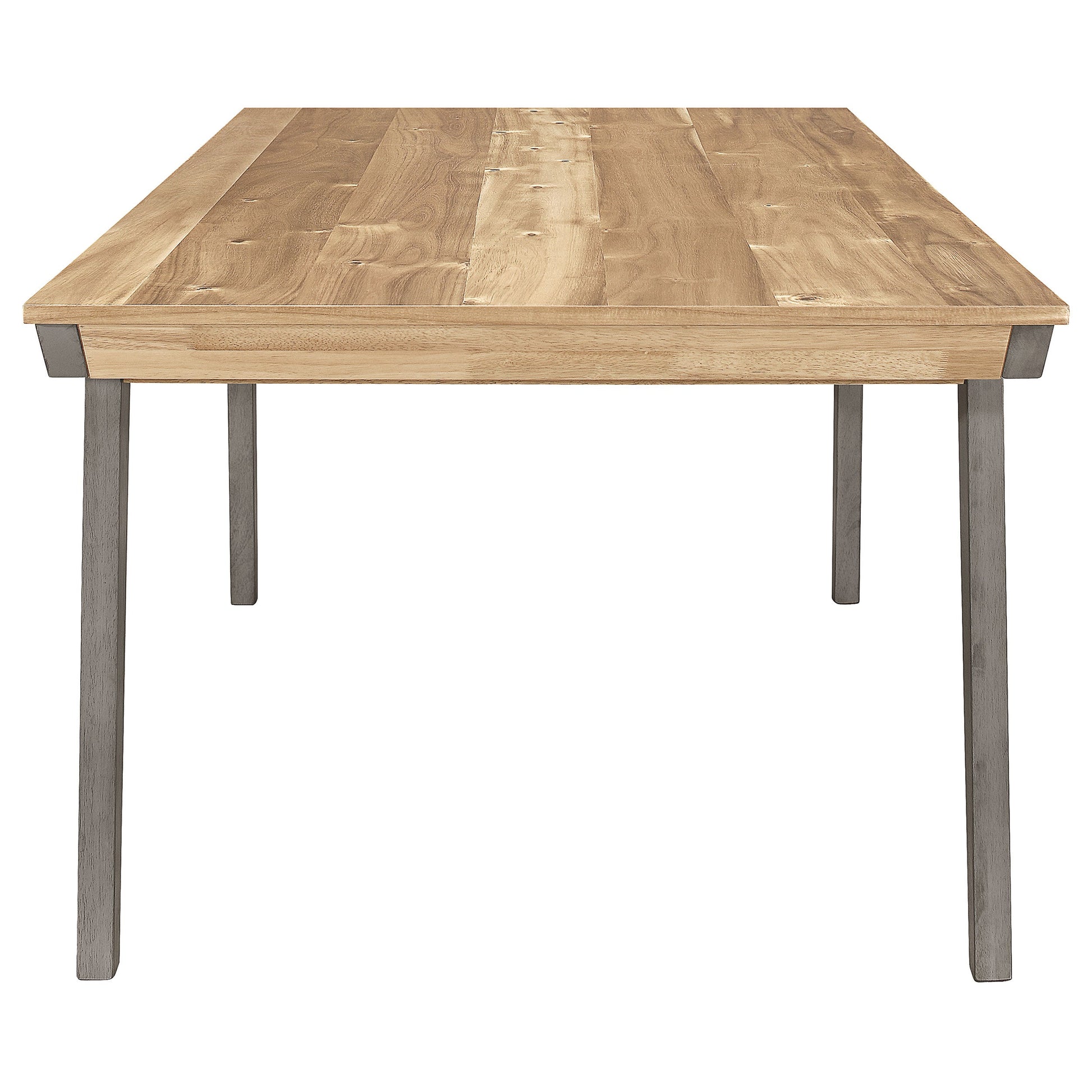 Place this modern farmhouse style dining set in a home for a more elegant look. Complete with a long table and four chairs, this dining set comes in a two-tone finish of a coastal grey and natural acacia wood finish. Each of the four chairs offer a curved slat style backrest and a padded seat, wrapped in a grey linen-like upholstery. The table adds a striking, contemporary vibe with its flared legs outward beveled edges. Invite the family to enjoy a casual meal and catch up with each other's lives.