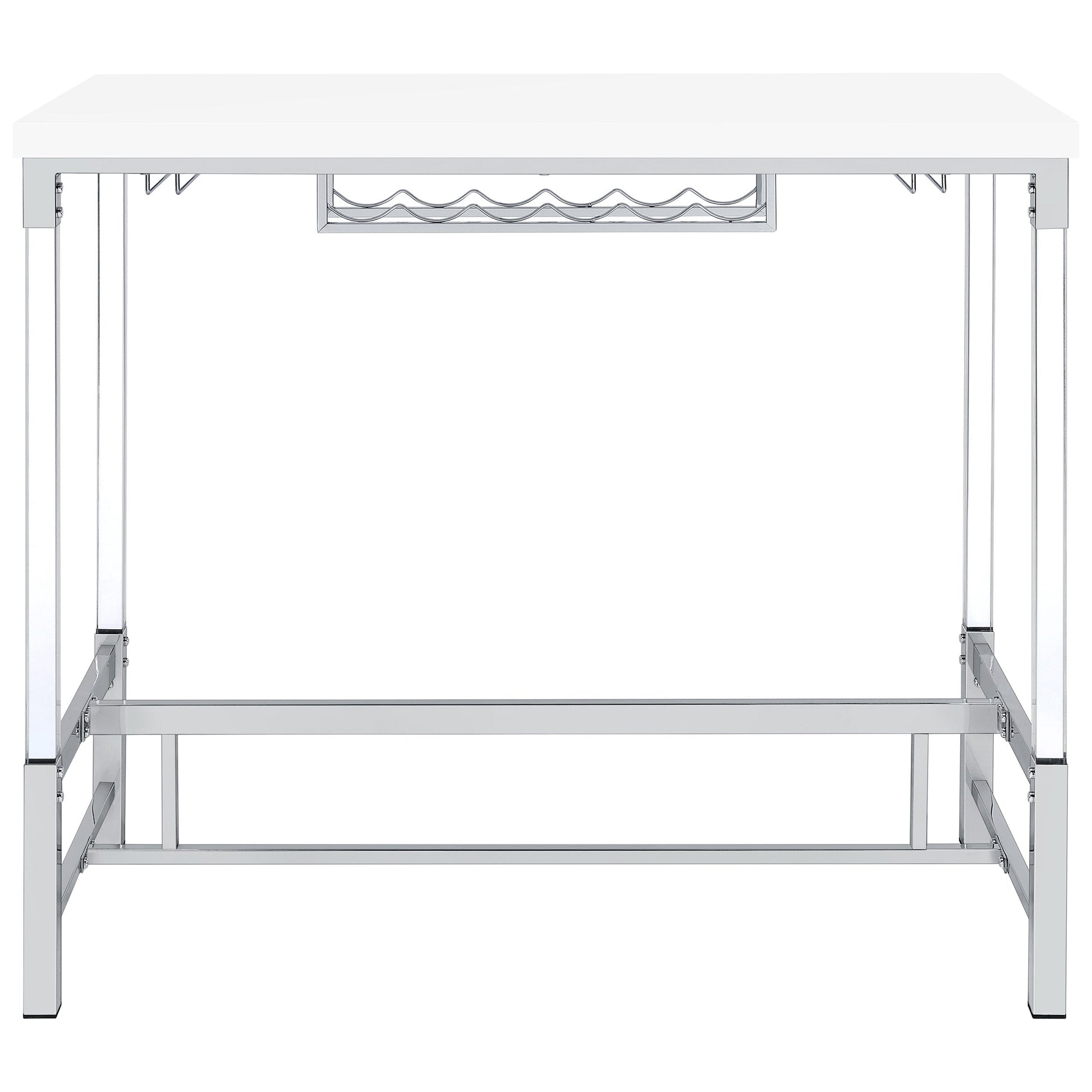 Create the ideal spot to share a bottle of wine with friends with a contemporary bar table. Perfect for two to four, it boasts a crisp, streamlined silhouette with an elevated tabletop in a bright white finish. The base features a silver finish and trestle details. Acrylic legs add a sense of light, airy ambiance, perfect for a compact nook or dining room. The table includes a built-in six-bottle wine rack and two stemware racks that make pouring a glass of your favorite vintage simple and easy.