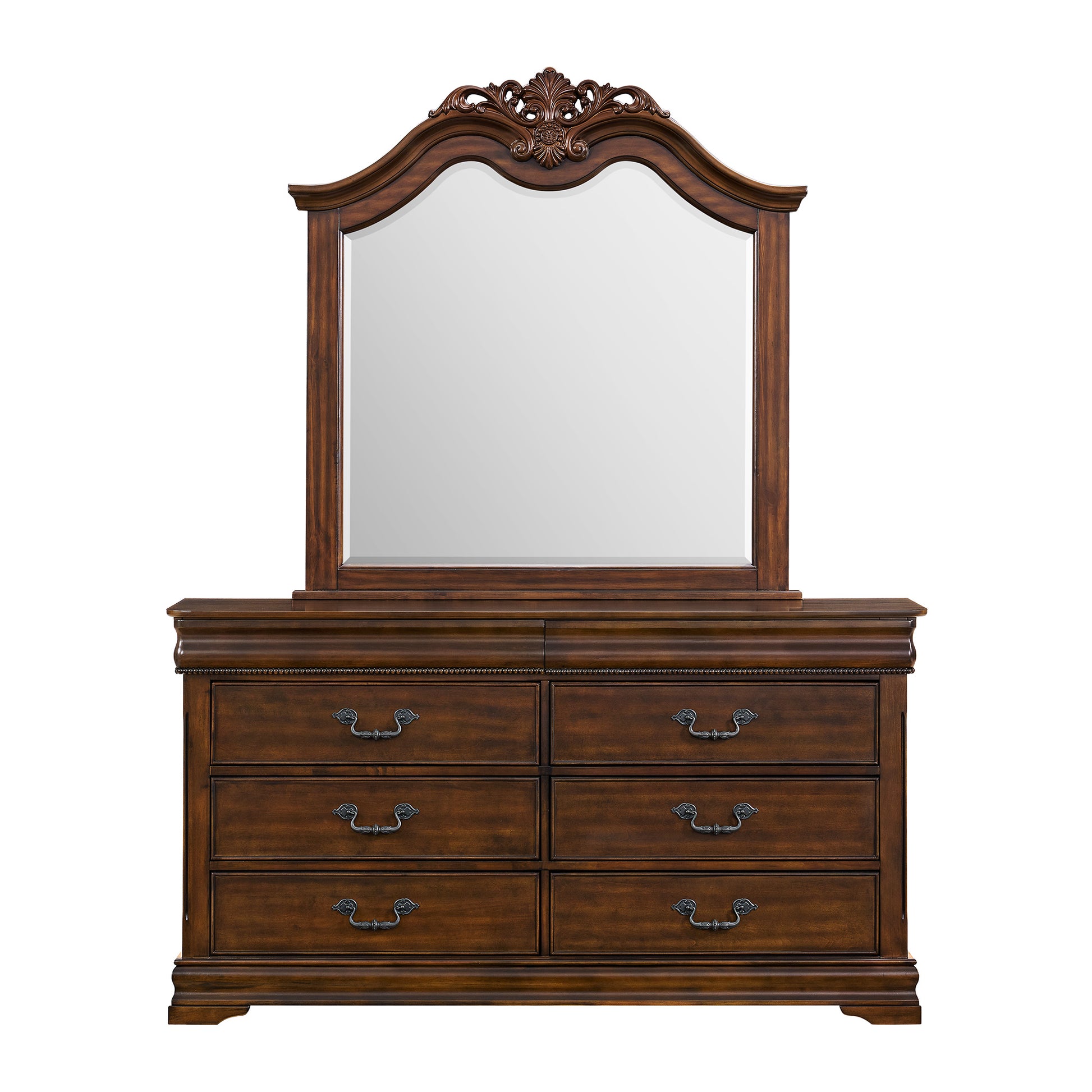 Transform your bedroom into a luxurious retreat with the Northridge Dresser & Mirror Set. Constructed of sturdy pine wood with MDF birch veneer, this case piece exudes traditional craftsmanship. It features a stunning arched mirror with intricate molding that sets this piece apart from others. The top drawers are lined with coffee-colored felt, providing extra protection for your belongings. The antique style hardware adds a vintage touch to the overall aesthetic. Bring home this exceptional collection in a warm, rich cherry finish and elevate your bedroom dcor to new heights of elegance.