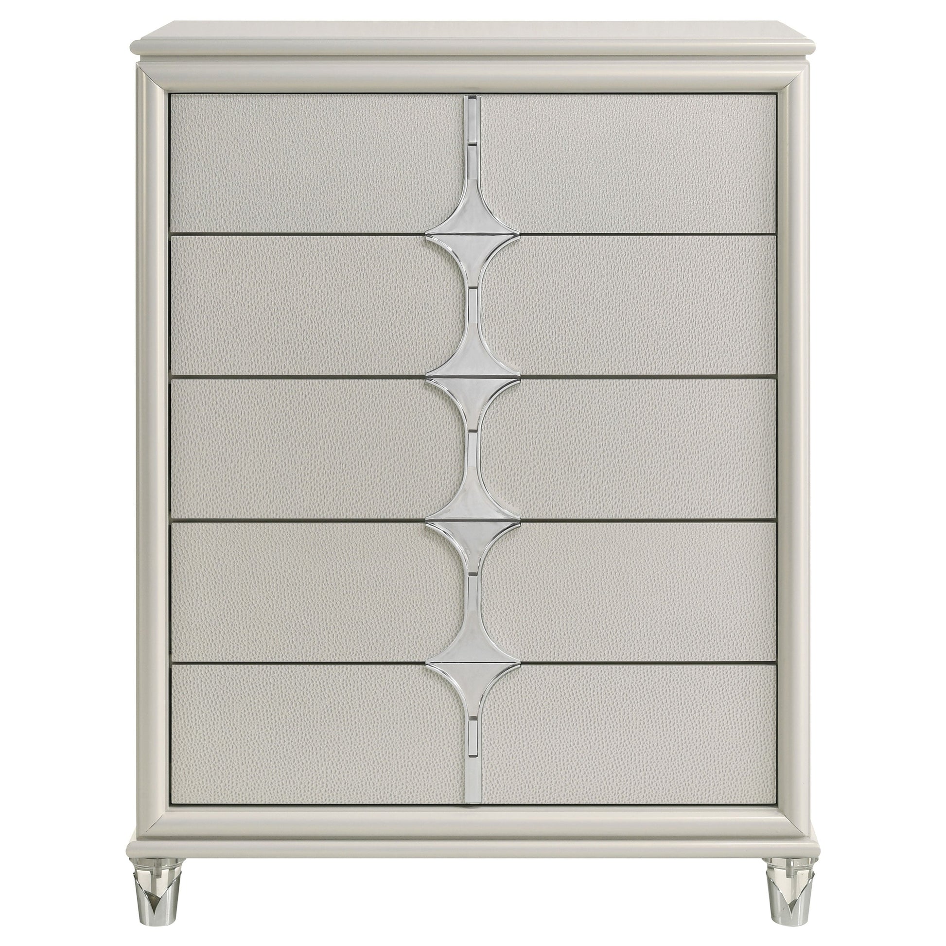 Discover elegance and functionality with this beautifully crafted chest, designed to complement your bedroom suite. The pearl white finish, highlighted by the unique diamond star drawer fronts and chrome metal pulls, exudes a contemporary charm. Acrylic feet with polished chrome caps add a touch of sophistication. Offering ample storage, this chest keeps your space organized while enhancing your room’s aesthetic. Experience the perfect blend of style and practicality with this exceptional piece.