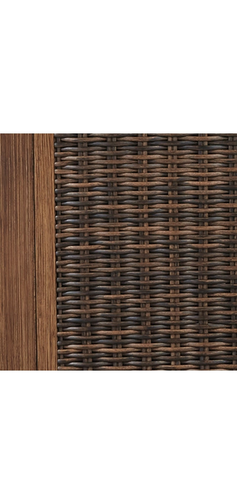 - Table has wood-look top; side panels accented with all-weather, handwoven resin wicker