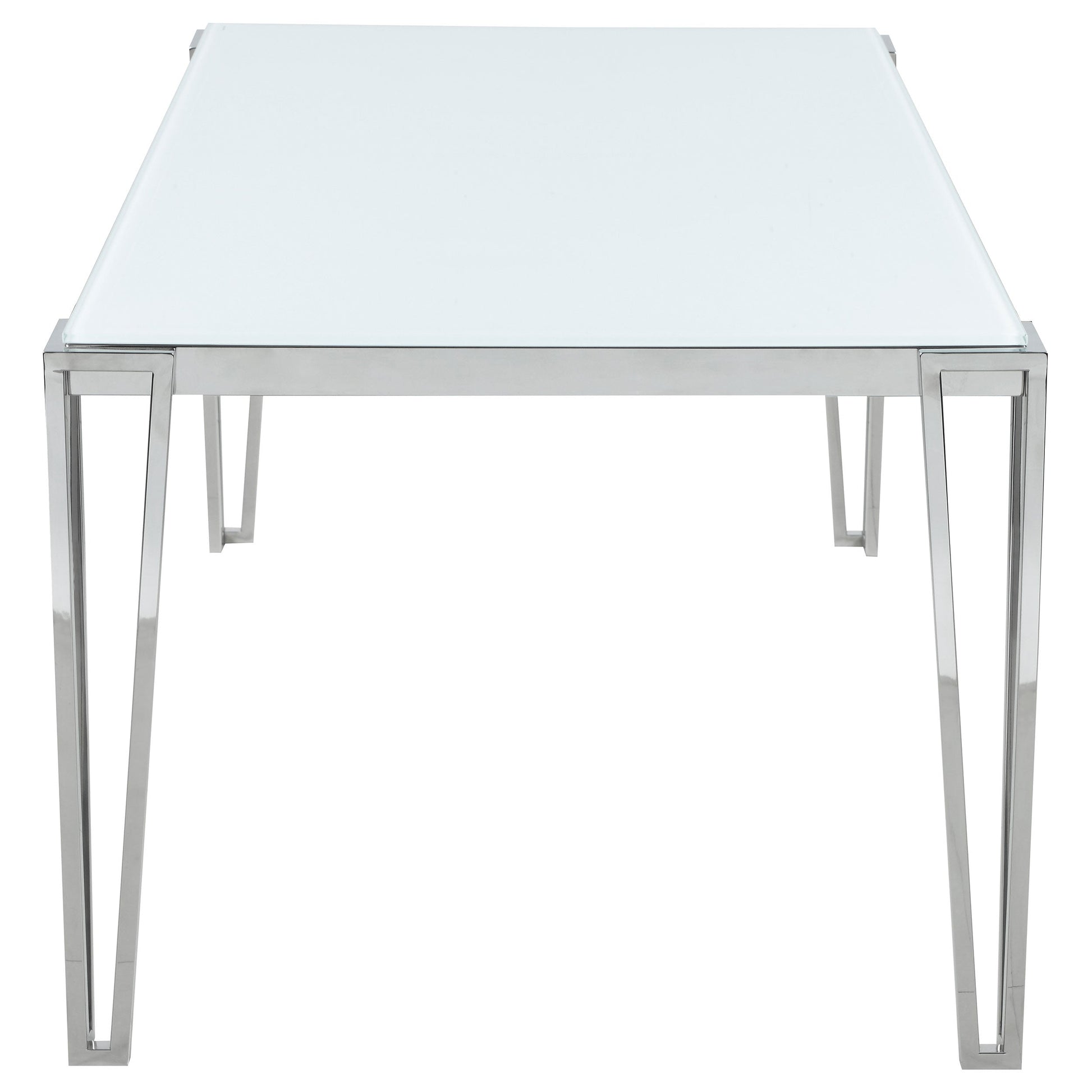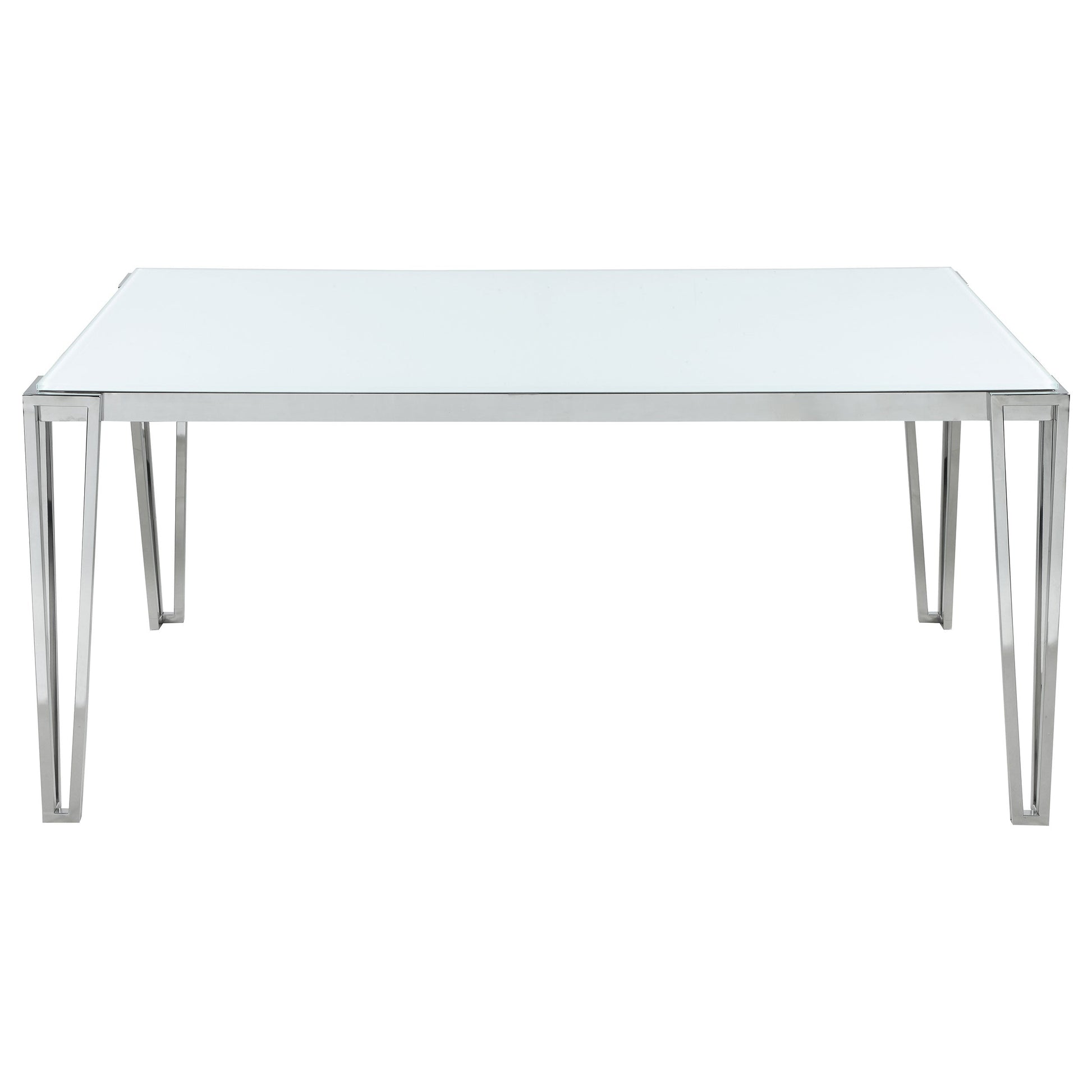 Perfect for contemporary dining rooms, this rectangle dining table offers seating for up to six guests. Designed with clean lines and a minimal silhouette, this table can be used a more casual modern piece or elevated into a formal dining table. Built of sturdy stainless steel metal with a polished chrome finish, it's easy to maintain and made to last for many years in the home. Each hairpin-inspired leg is made modern with slim corner brackets. Rested on top of a white frosted tempered glass tabletop surface that can complement your home's already existing colors.