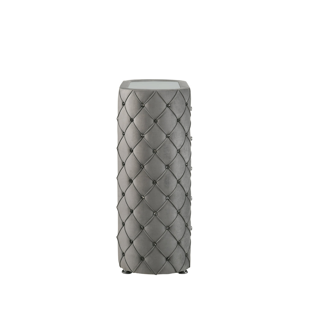 The Perine Collection is luxuriously designed and upholstered in sumptuous gray velvet and features black piping. The hardwood wooden frame is designed for long-lasting enjoyment. The crown design on the headboard and footboard adds some drama to the bed. Glistening crystal-like button tufting is carried out through the piece for a regal look. This magnificent bed conveys a majesty that you can feel throughout the home.