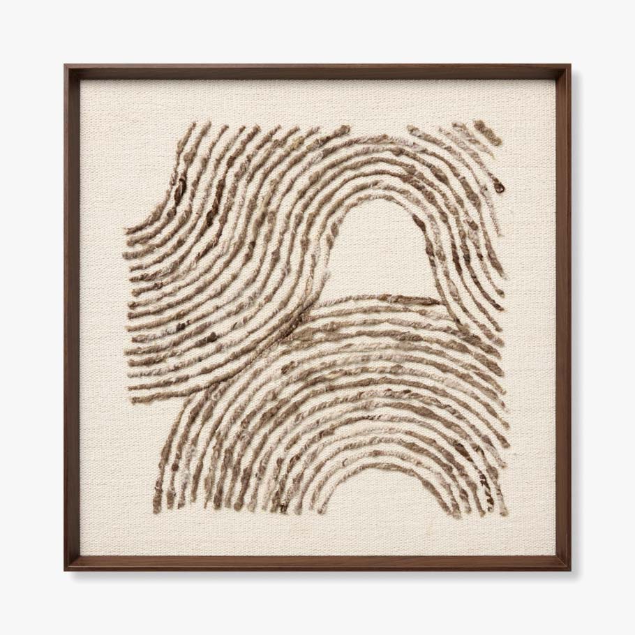 Phase is hand-woven wall art with a black-and-ivory curving abstract design, a neutral accent for bohemian or natural home decor. The artwork is crafted in India from wool, cotton, polyester, and other fibers, and custom-framed by Loloi in the USA, measuring 33" x 33".