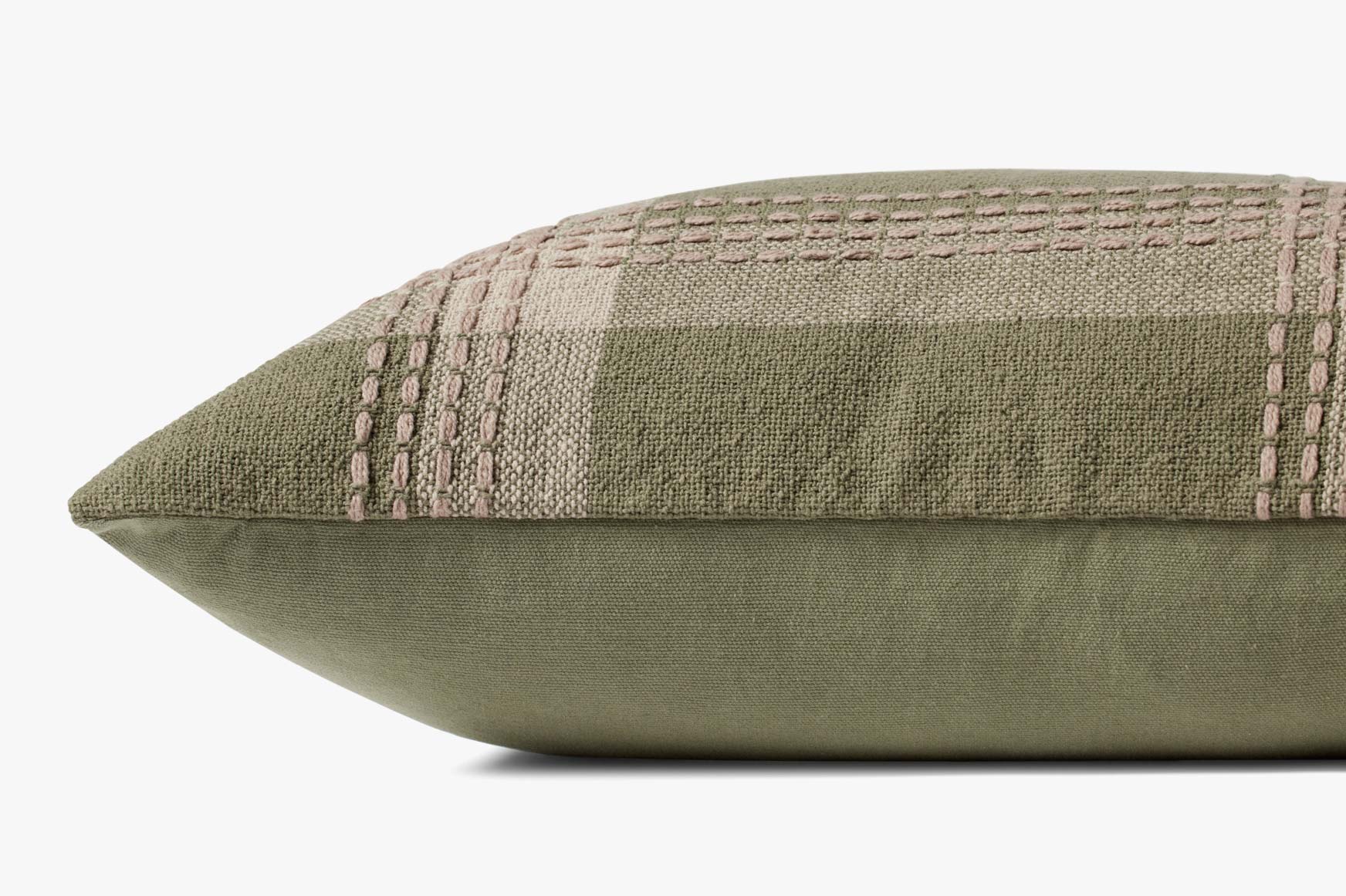 This sage green throw pillow from Jean Stoffer x Loloi features a cottage-inspired plaid pattern with stitched details. The pillow cover is made of cotton and measures 18” x 18”, a standard size to style in living rooms and bedrooms.