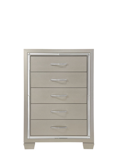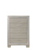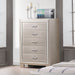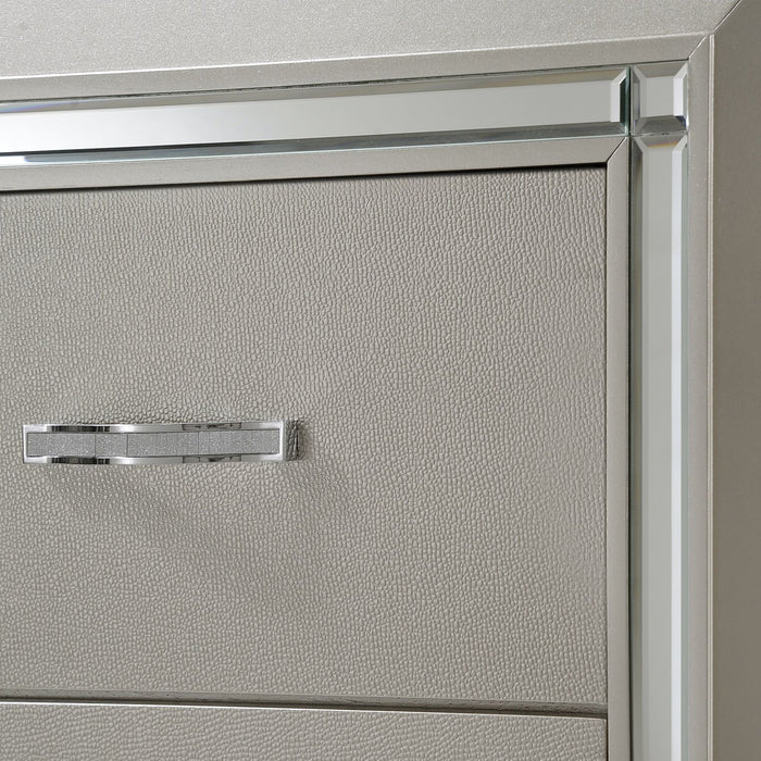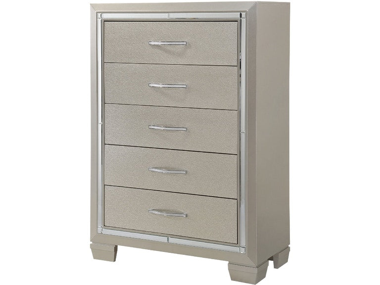 The Platinum Chest is sure to delight your glamour queen! This chest of drawers comes with five spacious, perfect for keeping all of your belongings neatly stored away. This vertical chest features a mirror glass trim along the front, while the chrome drawer handles feature crystal-like accents. This chest comes in a chic, champagne color adding instant glamour to your bedroom. Sleek, clean lines with bracket feet complete the look of this glamorous chest.