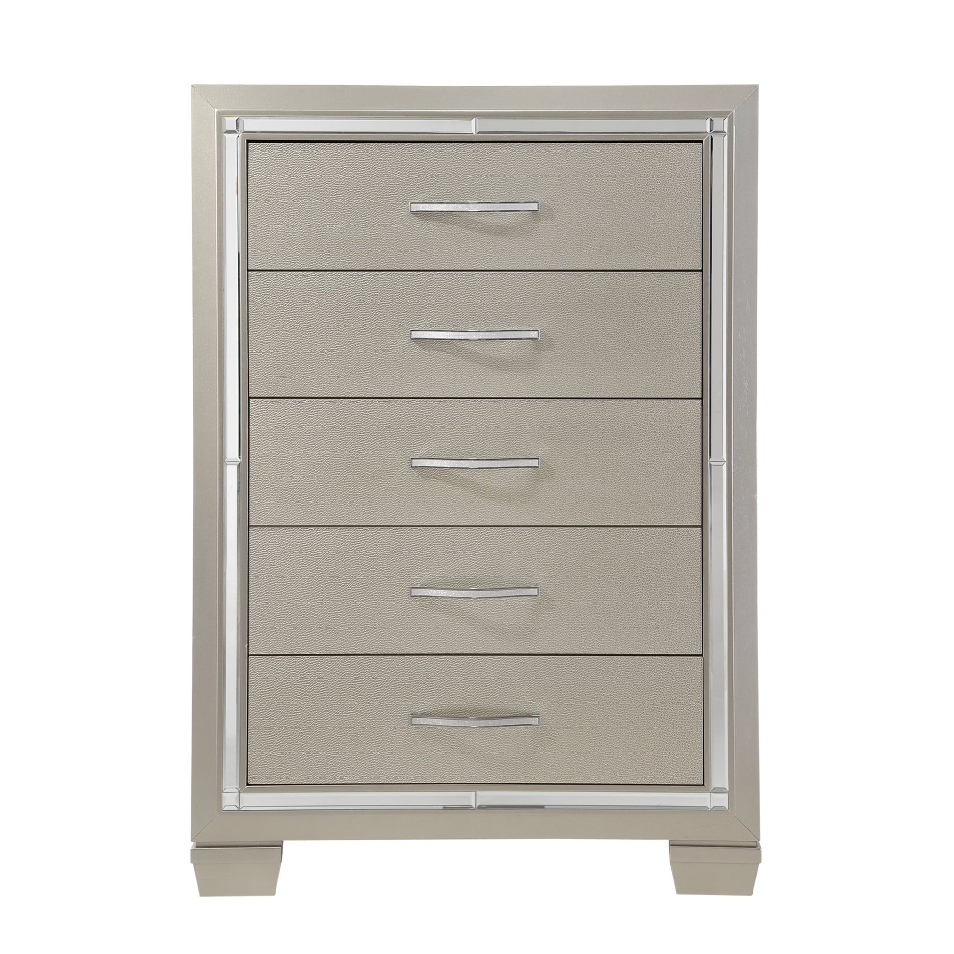The Platinum 5-Drawer Chest adds instant Platinum to your bedroom! This stylish chest of drawers comes with five, spacious drawers. More than enough space to store all of your belongings. The vertical chest features clean, sleek lines and stylish bracket feet. Mirror glass trim accents the front of the chest, while chrome drawer handles with crystal-like accents bring the glam to your bedroom. This chest of drawers is finished in a chic, champagne color making it easy for this style to transition with every style phase you go through.