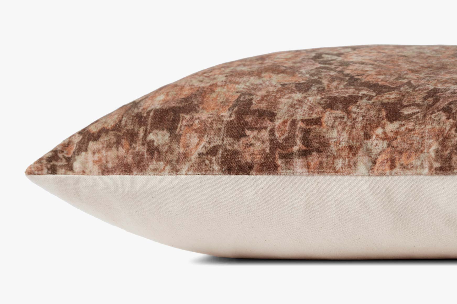 This elegant throw pillow is inspired by vintage rugs with floral motifs, in gently distressed dusty rose and clay tones. Power-loomed of 100% cotton in India.