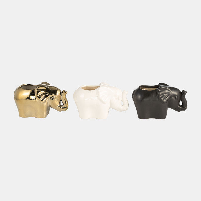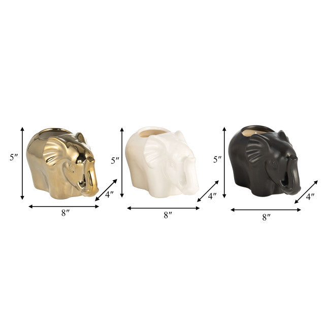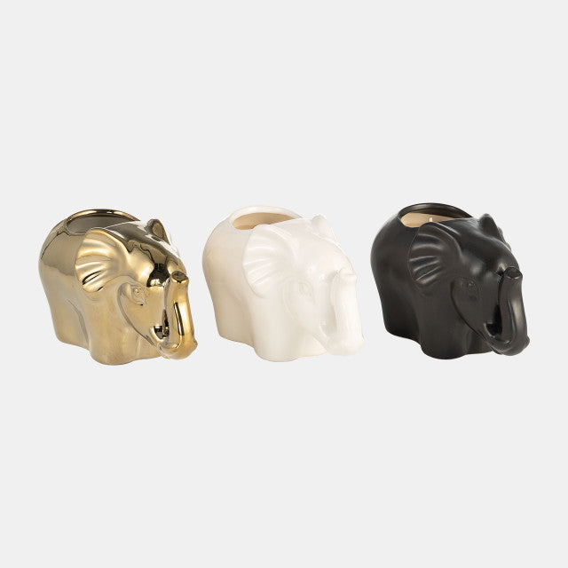 Elevate the charm and sophistication of your indoor living spaces with the Sagebrook Home Set of Three Ceramic Elephant Soy Candles in Plumeria Scent. Designed by Liv & Skye, this delightful set features three charming ceramic elephant-shaped candles in gold, black, and white hues. The 9oz soy candles provide a long-lasting soothing and inviting atmosphere in your home. Crafted from high-quality ceramic, these durable candles measure 7 inches in diameter x 5 inches high, making them ideally sized for any space. These candles make an ideal gift for friends and family who appreciate the simple pleasures of a well-crafted candle.