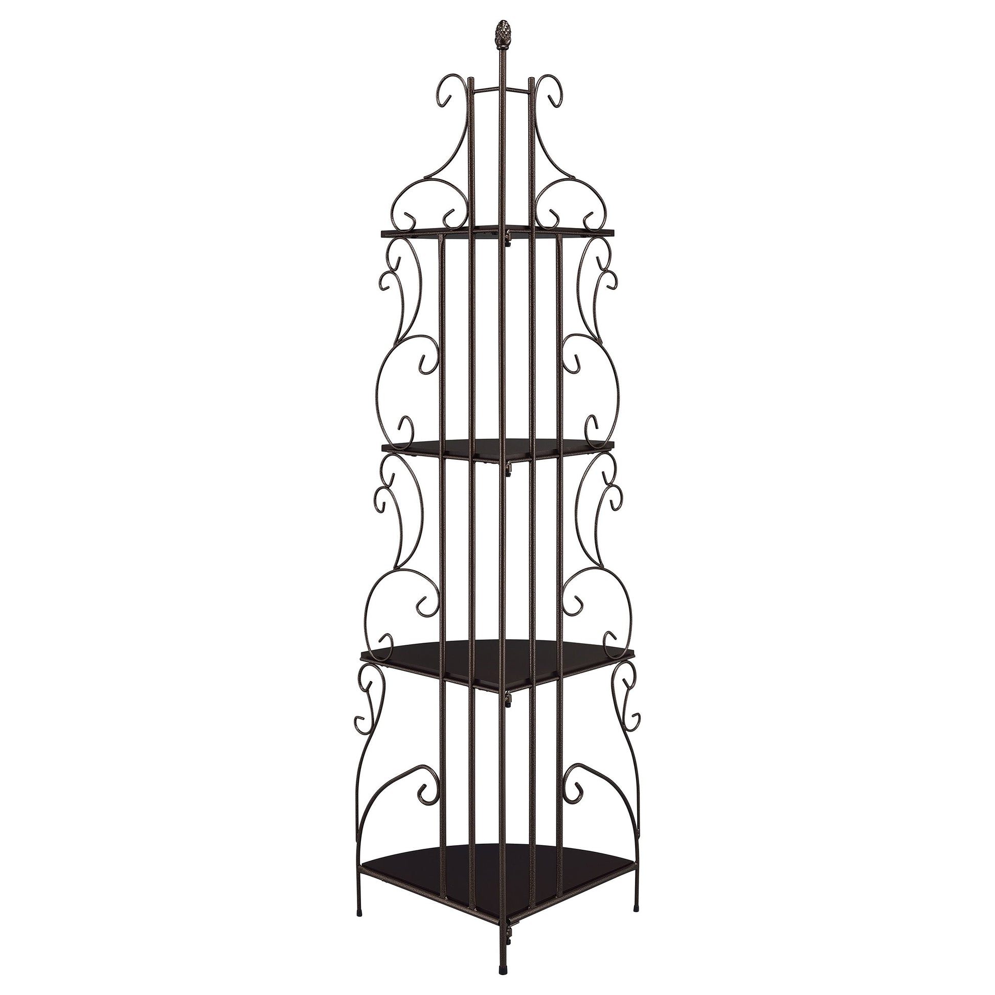 Ratchet up the romance in a traditional space. Designed to bolster the traditional look of a central living space, this corner bookcase is a great choice. Four graduated tiers create a subtle silhouette and offer plenty of space to display books, decor, and potted plants. Made from steel and wood-like material, it blends an earthy elegance with old fashioned charm. Warm any space with its luscious cappuccino and copper finish.