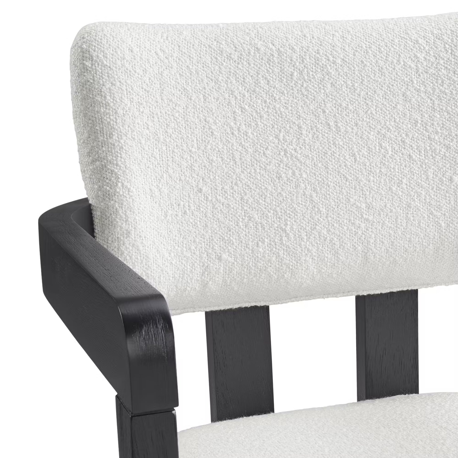 Elevate your dining or lounge space with this modern armchair set. Designed with sleek black wooden frames and plush snow-white fabric upholstery, these chairs combine bold style with everyday comfort. The cushioned seat and gently curved backrest provide support, while the sturdy armrests add both function and flair. Whether gathered around the dining table or placed as accent seating, these chairs bring a sophisticated yet contemporary touch to any room.