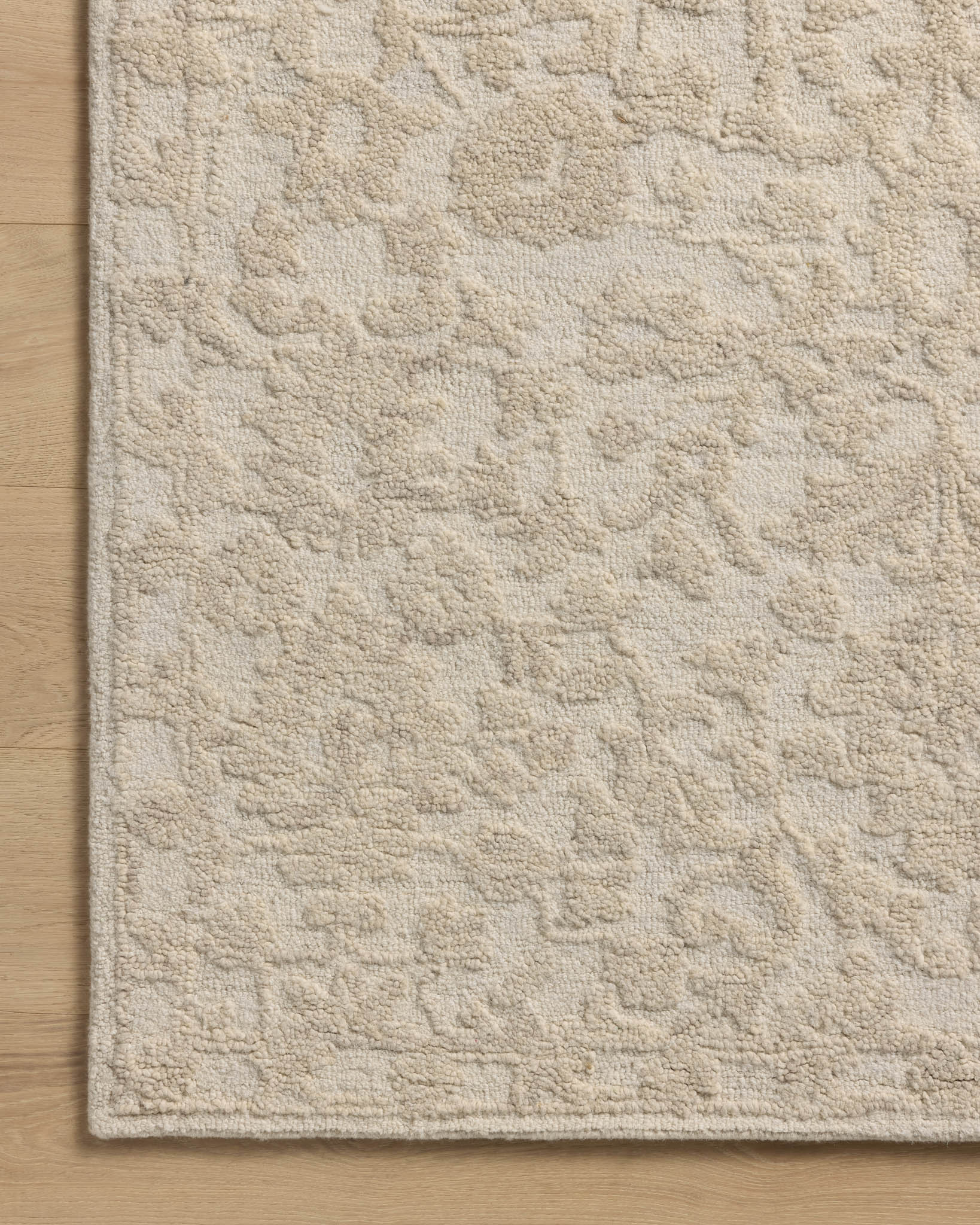 The Prudence Collection is a hand-tufted area rug made of soft, space-dyed wool and cotton, which lends a subtle gradation of color throughout the floral design. The rugs background is low-looped, while the pattern is made with a chunky, higher loop to create even more depth in this sophisticated design. This collection is hand-tufted of wool and cotton in India and Goodweave-certified, ensuring our commitment to ethical production and the support of weavers communities.