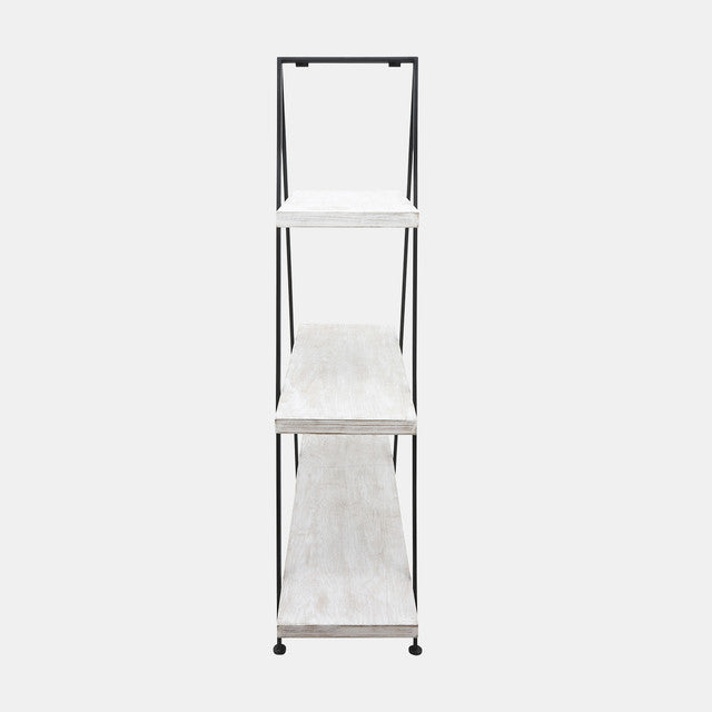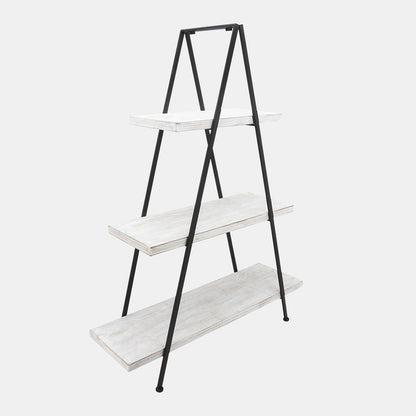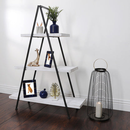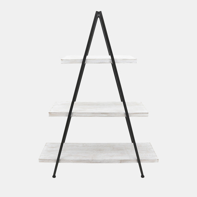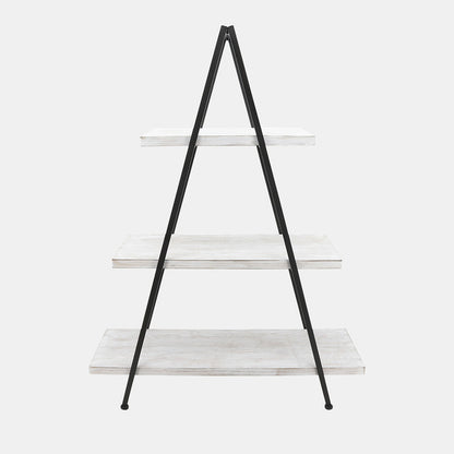 This 54"H Pyramid Shelf adds a trendy and stylish touch to any living space in your home. The black metal and white wood materials make it versatile and stylish, while the pyramid design provides ample storage and display space for your treasures. This piece is perfect for your living room, bedroom, or office. The product offers the durability of metal and the natural beauty of wood.