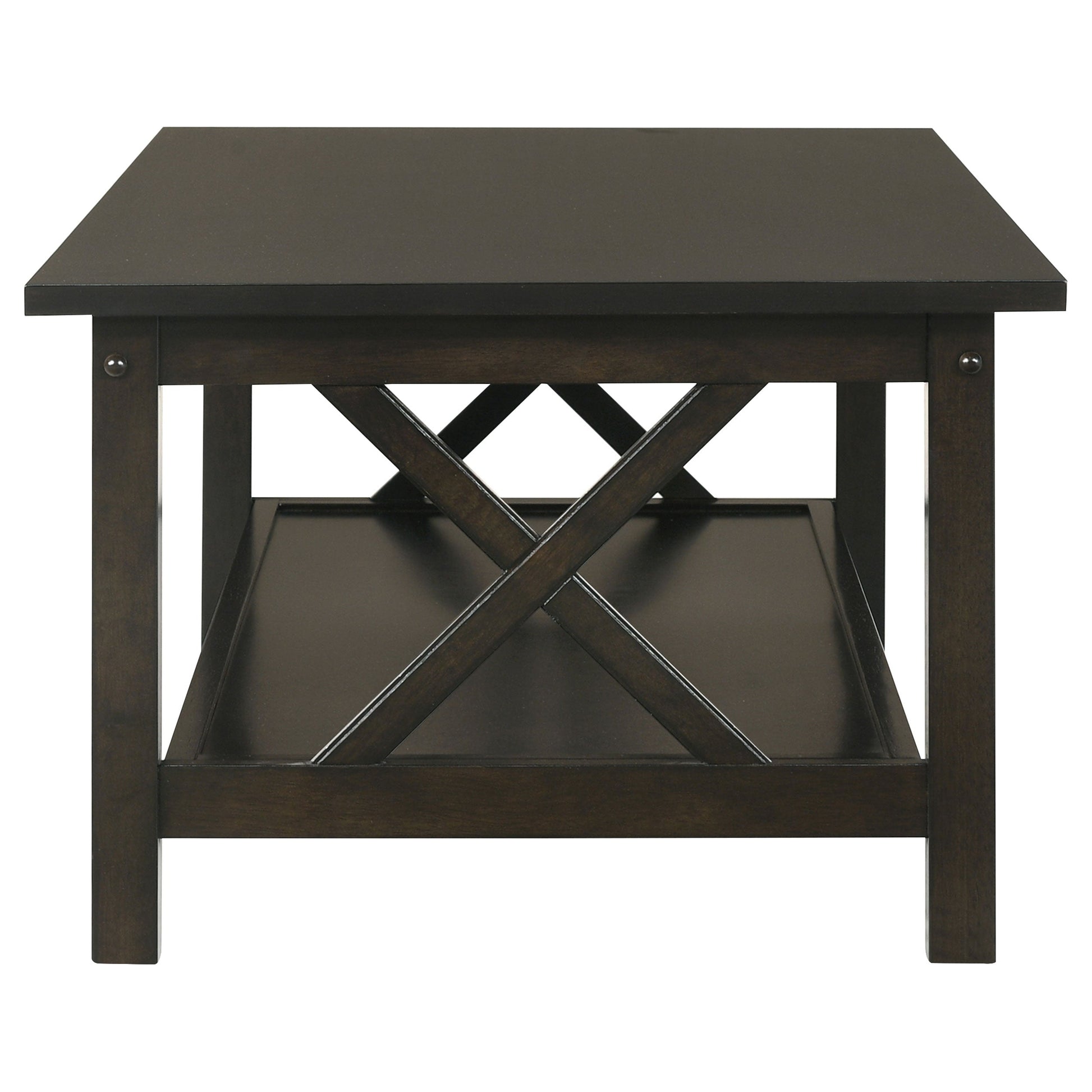 This 3-piece occasional table set includes a coffee table and two end tables, ideal for a living room or lounge. Constructed from hardwood, engineered wood, and rubberwood veneer, this set showcases a rich dark merlot finish. Each piece is designed with a lower shelf for extra storage space, while the X-shaped accents on the sides add a touch of visual appeal. This coffee table set is a perfect combination of form and function for your home.